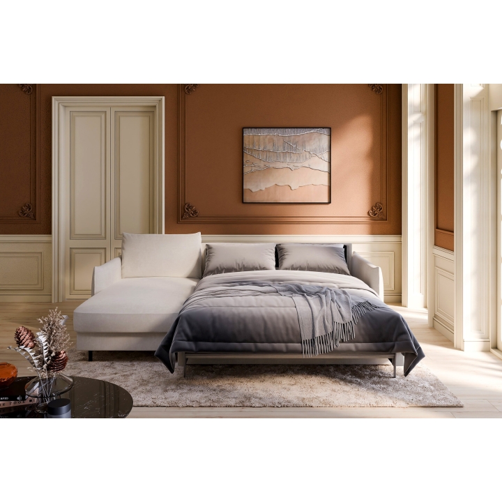 The model also offers a sleeping function with an Italian frame mechanism, providing a stable and comfortable sleeping surface. The sleeping area measures 140 × 190 cm, offering ample space for one or two people. The seat height is 50 cm, the seat depth 58 cm, and the backrest height 42 cm, ensuring a pleasant sitting posture.