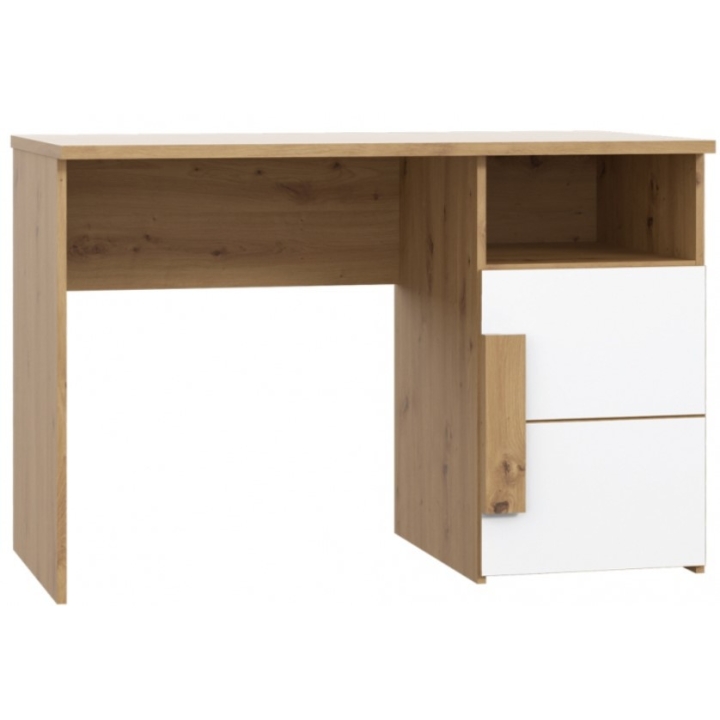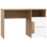 The Arkina desk from furniture manufacturer Forte is a youthful, lightweight study and work desk for teenagers. The neat piece of furniture does not take up a lot of space, and the 110 cm wide and 60 cm deep top allows for free work along with space for placing accessories such as a pencil case, notebooks, notebooks or a laptop. In the under-counter part of the Arkina desk, located on the left side, there is a capacious cupboard and an alcove (open shelf) that is sure to accommodate all textbooks, small electronics such as chargers or tablets and school accessories. The maximum load for the top is 20 kg, for the shelves 5 kg each. The desk is made of furniture board and has a light, natural oak colour with elements of white matt. The simple form, the choice of colours and geometric details such as the cabinet handle give a modern style to the piece.