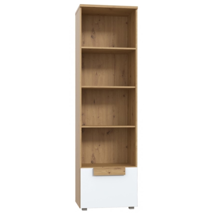 A tall and narrow bookcase from the Arkina collection by Forte with open shelves for books, souvenirs, photos or electronic gadgets is a practical and necessary piece of equipment for a teenager's room. TheArkinacollection of youthful, modern furniture has been thought out according to the needs of young people. The bookcase is consistent with minimalist and modern trends. It has four recesses with shelves and a lower, closed cabinet with an interesting geometric handle. The whole is kept in a consistent, light and universal colour scheme of wood and white.
