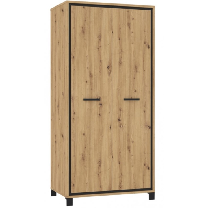 The wardrobe wardrobe from the Trondheim collection from Forte is a piece of furniture attracting attention with its composition of colours and raw form, while remaining simple and functional. The two-door wardrobe behind fronts in the colour of oak artisan hides a lot of space for wardrobe organisation. Divided into two equal parts, the wardrobe contains a shelf and a bar in each, as well as three additional shelves that can be freely mounted on the left and right sides. The symmetrical design, preserved thanks to the central arrangement of metal handles in a straight line and the use of a stylish black frame surrounding the fronts, makes the wardrobe bring harmony to the interior, without overwhelming in size. The clever internal division allows the furniture to be used as a wardrobe wardrobe in the bedroom as well as in the hallway.