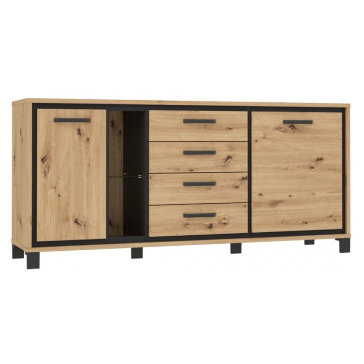 The Trondheimchest of drawers from the manufacturer Forte is an elegant piece of furniture preserved, like the entire Trondheim collection, in a raw, industrial and modern style. The wide segment has been divided into several zones. On the right we have a cabinet and a glazed vertical display, then four drawers, and the whole is closed on the left by a capacious, wide cabinet with a shelf. The beautiful fronts combine the natural colour of light artisan oak with black oak. Designer details such as black metal handles, low legs and a black border on the entire front are the icing on the cake that tie the furniture together with the entire Trondheim collection. The wide Trondheim chest of drawers from Forte also makes it possible to use its top for setting multimedia equipment, decorations or books and other representative items.