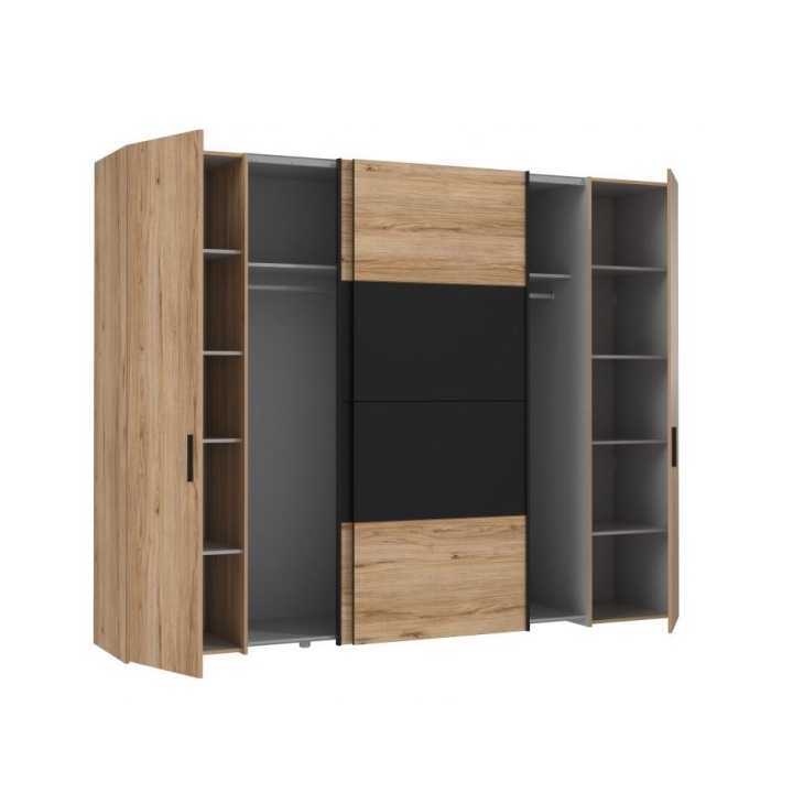 The two-door wardrobe from the Dalate collection is made of a durable and solid furniture board in the colours of Oak Catania and matte black. This combination makes the piece of furniture look very elegant and will certainly give a chic look to any bedroom or wardrobe. The Dalate wardrobe is a very large and capacious piece of furniture with a rather unusual construction. The central part of the wardrobe has sliding doors, while the sides have standard, front-opening doors. The wardrobe consists of four parts, two of which are shelves with capacious shelves, while the other two are spaces with hanger rods and shelves located just above them. This solution will certainly provide plenty of storage space for practically all your wardrobe and will ensure that your home is properly sorted, tidy and orderly.