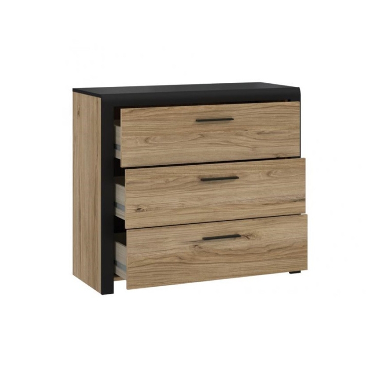 The Dalate chest of drawers from the Dalate collection by Forte is a modern piece of furniture finished in the fashionable oak Catania decor with accents in black matt. The furniture will certainly find its use in most fashionable, modern arrangements. The chest of drawers consists of three capacious drawers, which will allow you to organize, for example, tableware or home textiles. The edges of the tops have been finished with ABS plastic, and the whole is complemented by slender handles in matt black. The whole set looks very elegant, which will certainly add elegance to your interior. The furniture is perfect for a bedroom, living room or hallway. The chest of drawers is made of durable furniture board.
