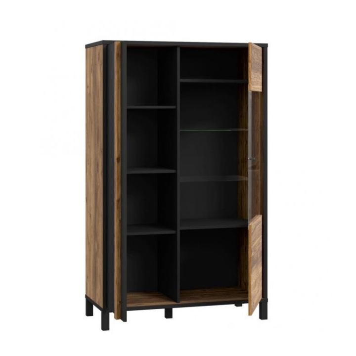 The living room is a representative place, where we like to spend time with family, friends or by ourselves - in a word, the showpiece of every home. It should be arranged in such a way as to create an atmosphere of harmony and tranquillity. The Hayato display meets these conditions: the predominant alpine spruce décor contrasted with matt black soothes the senses and gives the interior a cosy atmosphere. This furniture consists of two parts with doors with a soft-closing function: on the left side there are 4 shelves on which we can place plates or tablecloths, on the right side there are 3 glass shelves behind a pane of tempered glass, designed for displaying porcelain or decorative glass dishes. Four legs and a wall-mounting system provide stability and thus safety for fragile items. If you wish to add even more variety to the display, simply install additional lighting, which will make your collection look more attractive, especially after dark. The Hayato display cabinet will add glamour and splendour to a living room with a minimalist or industrial character.