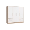The three-door wardrobe from the Forquick collection by Forte is a great solution that works well mainly in larger rooms. The spacious interior of the wardrobe allows you to effortlessly organize your belongings in an orderly manner. The Forquick wardrobe impresses with its exceptional functionality and elegant, minimalist design. Behind the three high doors, the wardrobe has a large interior consisting of a spacious compartment with a hanger rail and numerous shelves. There are also capacious drawers. The wardrobe is made of furniture board of the highest quality, stained in light, neutral colours. White matte in combination with the Sonoma Oak décor will add brightness to the room and refresh the arrangement !