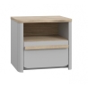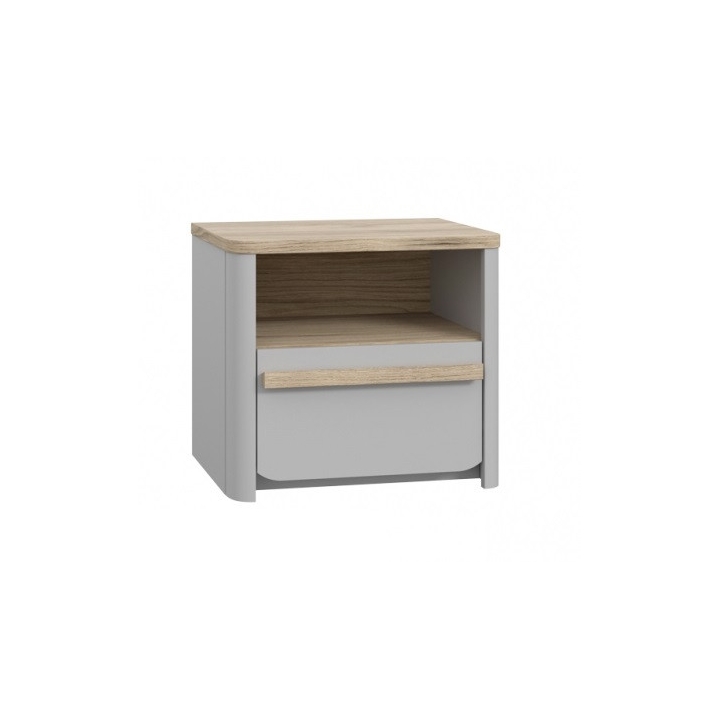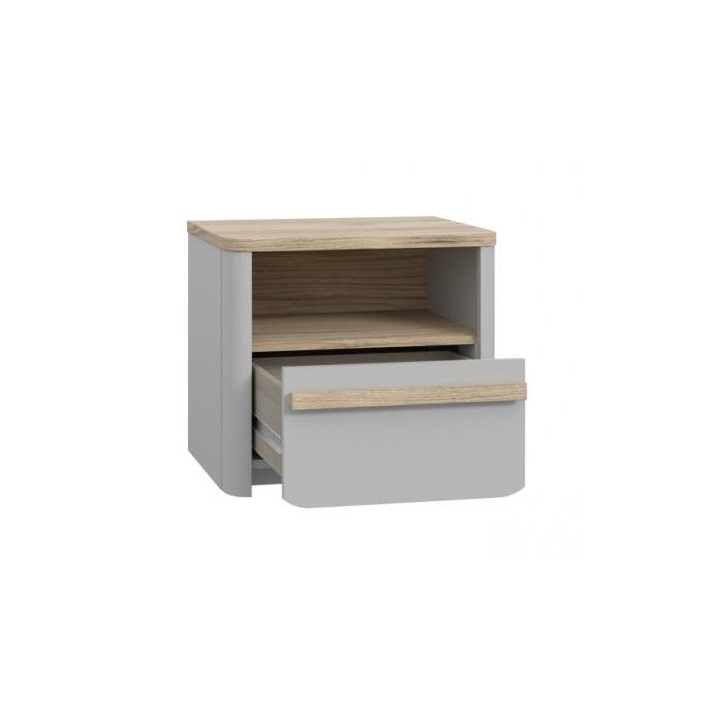 Modern bedside table from the Surfinio collection by Forte is a practical piece of furniture for every bedroom. The furniture is in the shape of a small, shapely cuboid, so you will easily find a place for it next to your bed without overwhelming other elements of the arrangement. The cabinet is equipped with a capacious drawer and a recess. The structure is topped with a smooth top, on which you can place items such as an alarm clock or bedside lamp. The product also looks great. It is made of durable furniture board in grey. A long, elongated handle stained in a wood shade adds to its charm.