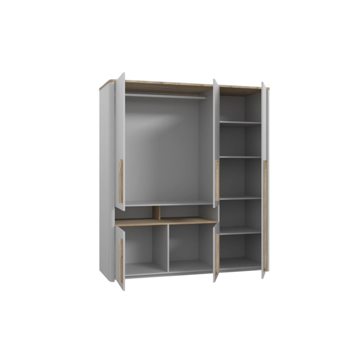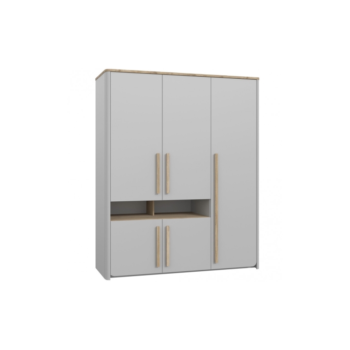 Are you dreaming of an aesthetically pleasing yet functional space? The Surfinio wardrobe from the Surfinio collection by Forte will be a hit! This piece of furniture boasts an unusually capacious interior. It features a number of smaller and larger shelves, thanks to which you can easily organise your things, arranging them according to your favourite system. An advantage of this model is its minimalist design, which combines a simple, geometric shape with subtle grey colouring. Elongated handles inspired by the colour of wood add charm. The wardrobe will go well in any interior, especially those arranged in a Scandinavian or modern style. The furniture is entirely made of furniture board characterised by high durability and resistance to scratches.