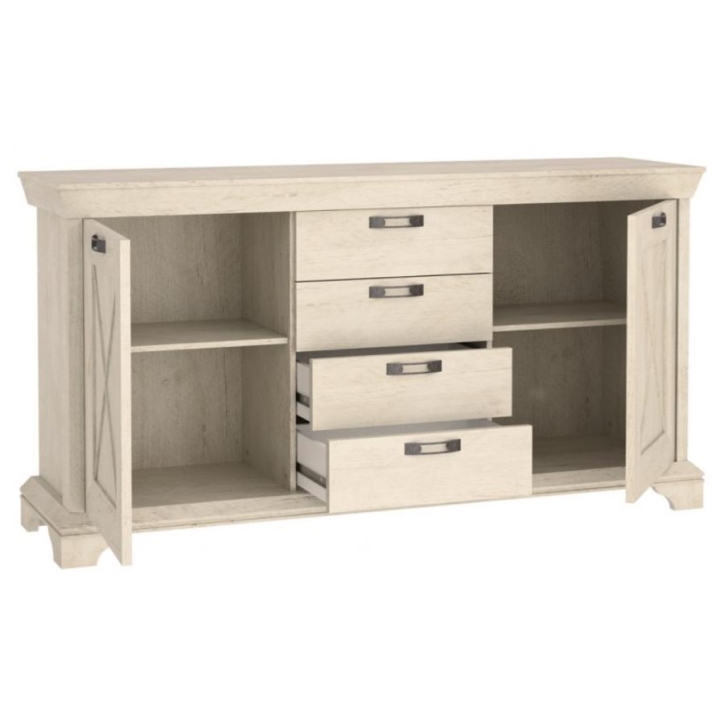 The elegant chest of drawers from the Kashmir collection by furniture manufacturer Forte is very capacious and refers to the Provencal style. The furniture with characteristic front ornaments and metal handles imitating old silver will look great in the living room or kitchen. The chest of drawers is made of thick plinths resting on solid and stable legs. The combination of a modern look with a classic design looks great in all interiors. The chest of drawers is available in White Pine and Cognac Walnut.