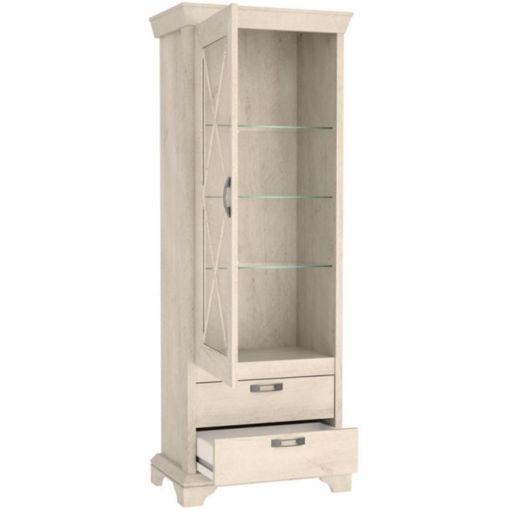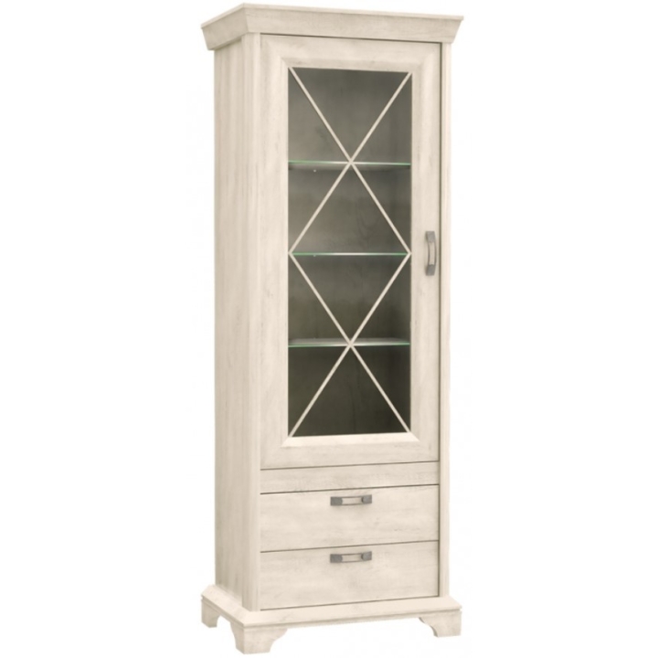 A modest yet modern design are the main characteristics of the narrow two-door display cabinet model Kashmir. One side of the furniture is glazed and is suitable for placing small objects or decorations. The dimensions of the display cabinet are small - 66 x 196 x 41 cm (width x height x depth), which makes it fit even in a small kitchen with some space left to use, or in a room or living room. The front of the furniture is covered by a foiled furniture board. It will fit perfectly into a Provençal-style interior.