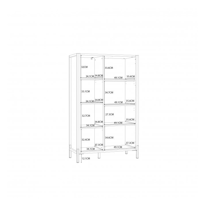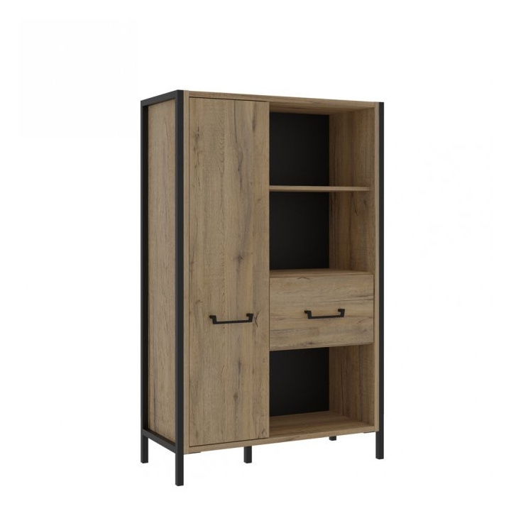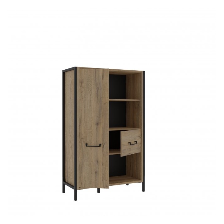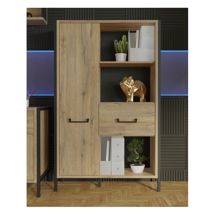 The right-hand bookcase from Forte 's Oriental Tree collection is a solid structure made of wood-coloured furniture board, suspended on a black metal frame that emphasises its geometry. The usable part consists of two basic elements - closed cabinets and open shelves. Thus, in addition to its storage function, the bookcase also fulfils a decorative and display role. Behind the large door on the left side there are four capacious shelves with height adjustment, while the right side consists of three open shelves and a cabinet closed with a door decorated with a black metal handle. The enrichment of the Oriental Tree bookcase with the functions of a wardrobe makes it a versatile piece of furniture suitable for all kinds of interiors in an industrial style.
