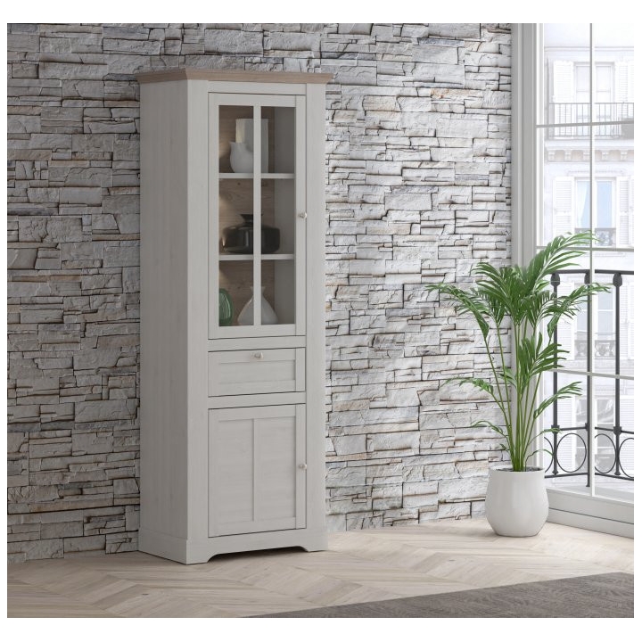 The tall display cabinet from the Iloppa collection by Forte is a stylish piece of furniture that will captivate all lovers of Provencal arrangements. The display cabinet is ideal for displaying tableware, cups or souvenirs. And all this thanks to a glass display case, additionally emphasised by tasteful lighting. The Iloppa display cabinet will be perfect for both modern and classic interiors. Coloured in a combination of Snowy Oak and Nelson Oak, it will delight everyone! The metal handles in patina on brass add a distinctive touch to the solid.