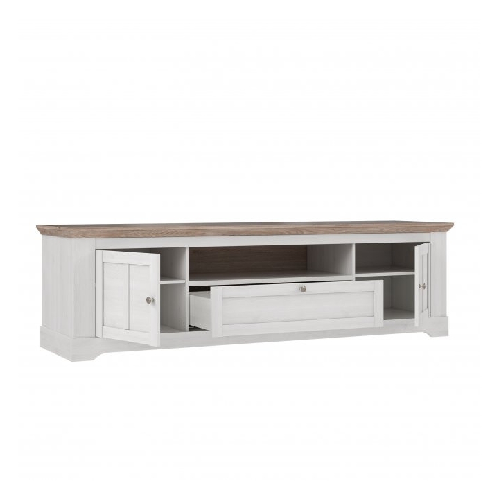 The RTV cabinet from the Iloppa collection byForte delights with its stylish design, which will perfectly fit into both modern and classic interiors. The Iloppa cabinet will perfectly fit into the arrangement of a living room or a day room, and will introduce a bit of Provencal climate into the interior. The furniture is made of chipboard and MDF in snow oak and nelson oak decor, which imitates the grain of wood. Simple metal handles in patina on brass will make it easy to access the contents of the drawers and cabinets. The cabinet has plenty of space for storing RTV equipment: an open shelf, a self-closing drawer and two cabinets equipped with a silent closing system.