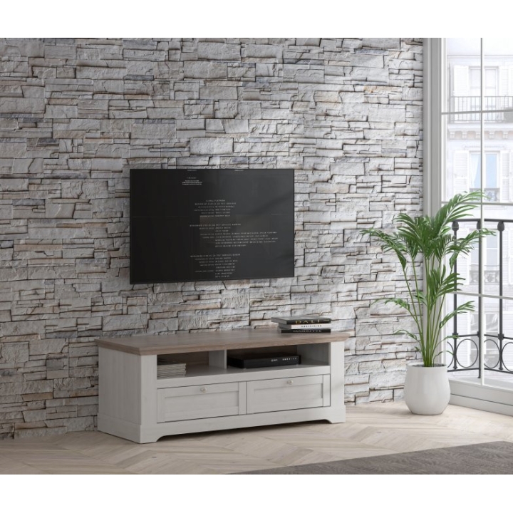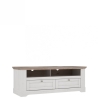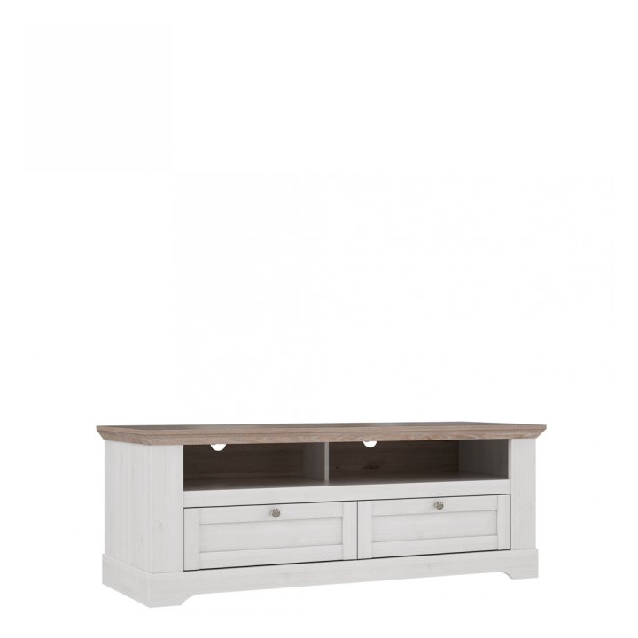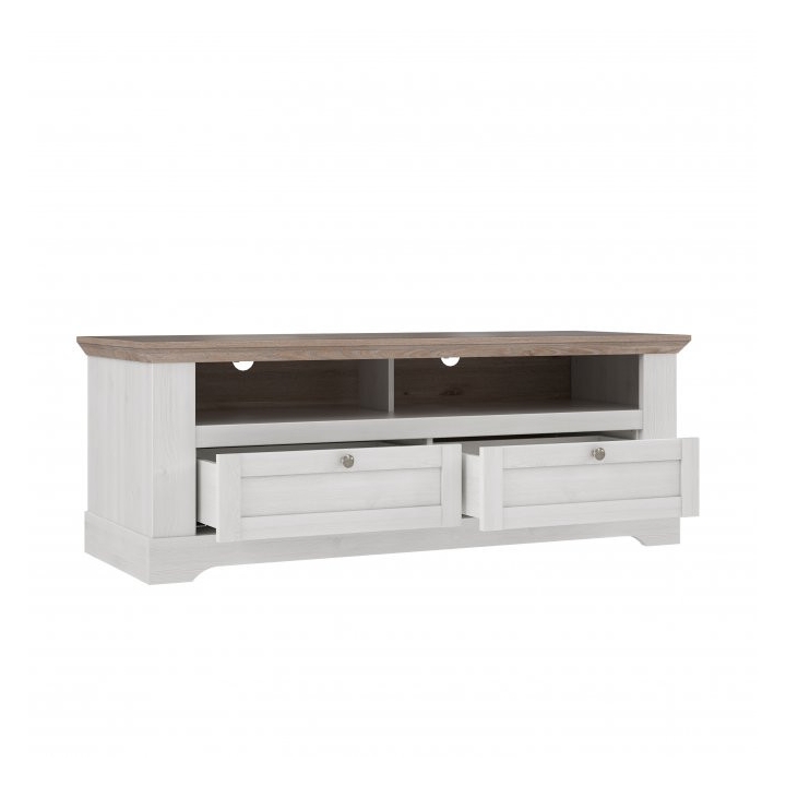 The RTV cabinet from the Iloppa collection will perfectly fit in with the arrangement of a living room or lounge. The furniture inspired by the Provencal style will add a homely, warm character to the interior. The Iloppa RTV cabinet was made in a combination of light Snowy Oak and Nelson Oak, thanks to which it looks very stylish and elegant. The cabinet has two open shelves and two self-closing drawers. Simple metal handles in patina on brass will make it easy to access the contents of the drawers and cabinets. The Iloppa RTV cabinet fits both modern and classic interiors.