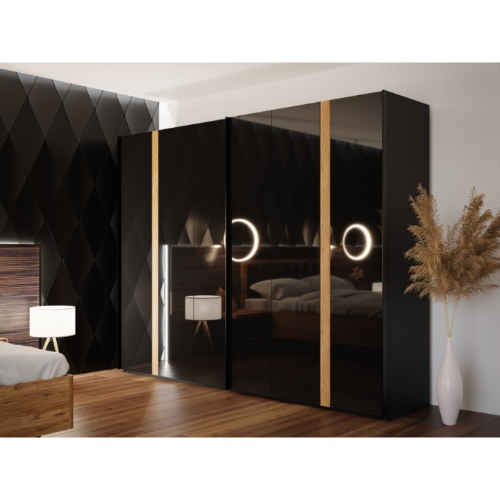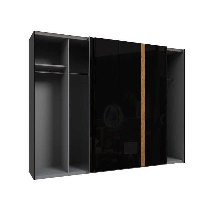 The Tuluza Black wardrobe is a piece of furniture dedicated to bedrooms in the glamour style. The effective look of the furniture is emphasised by a combination of the Black high-gloss décor with an insert in the Oak Catania décor. The Tuluza Black sliding wardrobe will perfectly replace a wardrobe and increase the level of functionality in the bedroom. Inside you will find two hanger rods of different widths, dedicated to different types of clothes. The internal shelves will make it easier to organise your stored jeans, jumpers and pyjamas. The Tuluza Black wardrobe is the basis of a wardrobe or a functional bedroom.