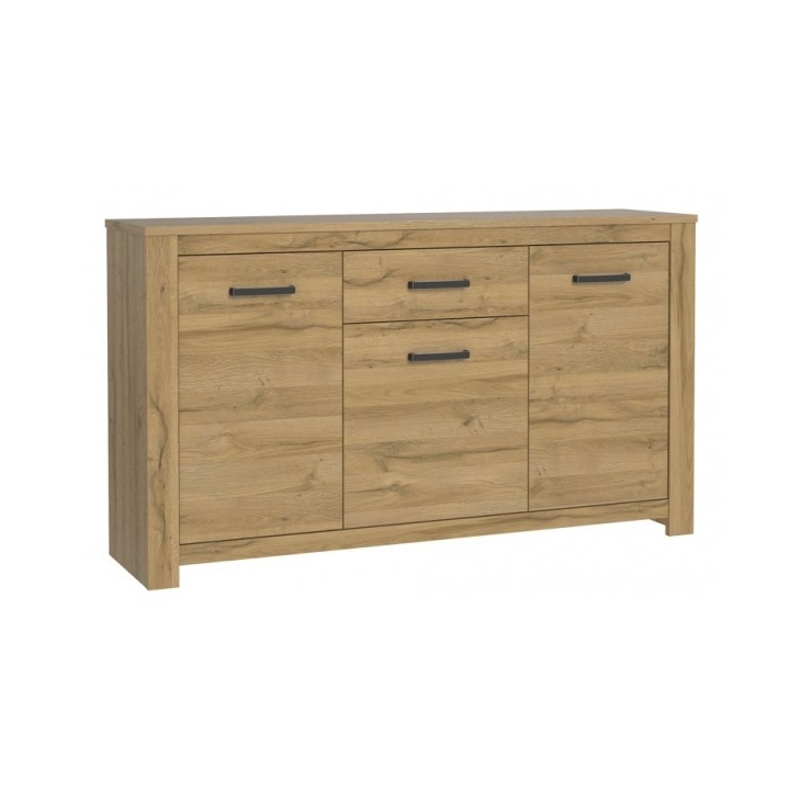 The elegant and modern Havanna chest of drawers from the manufacturer Forte is a capacious piece of furniture for the living room or dining room. Made in an aged oak wood décor with thickened slats, it optically creates a massive, solid and stylish whole. Three cabinets with shelves and a central drawer for small items will keep your household accessories organised. Black plastic handles contrast with the rest of the furniture giving it an industrial look. The Havanna chest of drawers from Forte will work perfectly in stylish, elegant and warm interiors as well as in modern and loft spaces.