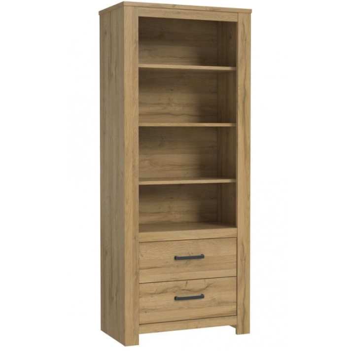A tall, elegant and modern bookcase from the Havanna collection model HVNR712 from the manufacturer Forte is a practical piece of furniture for the living room or dining room. A classic piece of furniture with shelves for books and decorations. Three shelves provide four capacious open niches for organising and displaying items which we want to please the eye and for which we often reach, such as records, books, games or various collections. Underneath, additional storage space for home accessories is offered by two drawers on ball bearing slides. The HVNR712 bookcase is made in an aged oak wood décor with bold slats to create a visually massive, solid and stylish unit. The black plastic handles contrast with the rest of the furniture, giving it an industrial look. The Havanna bookcase by Forte will be perfect for stylish, elegant and warm interiors as well as modern and loft spaces.