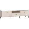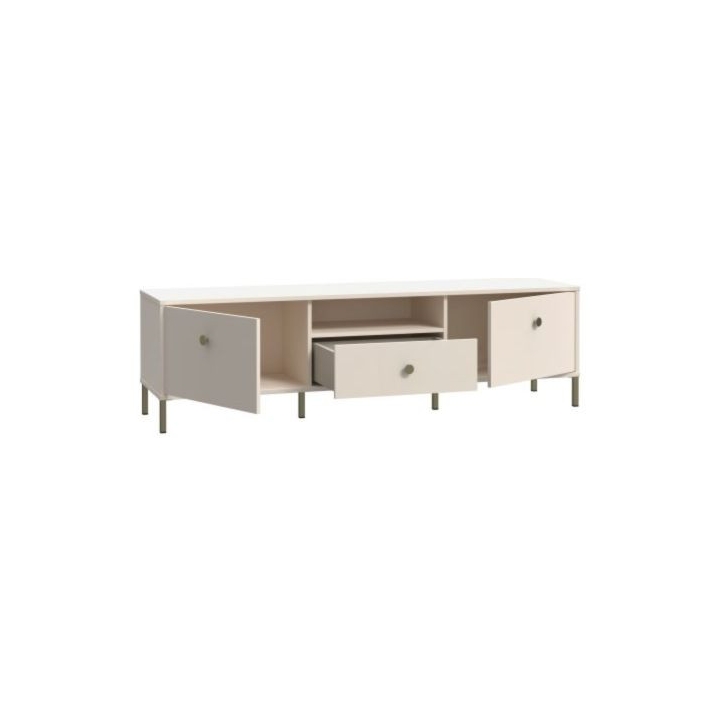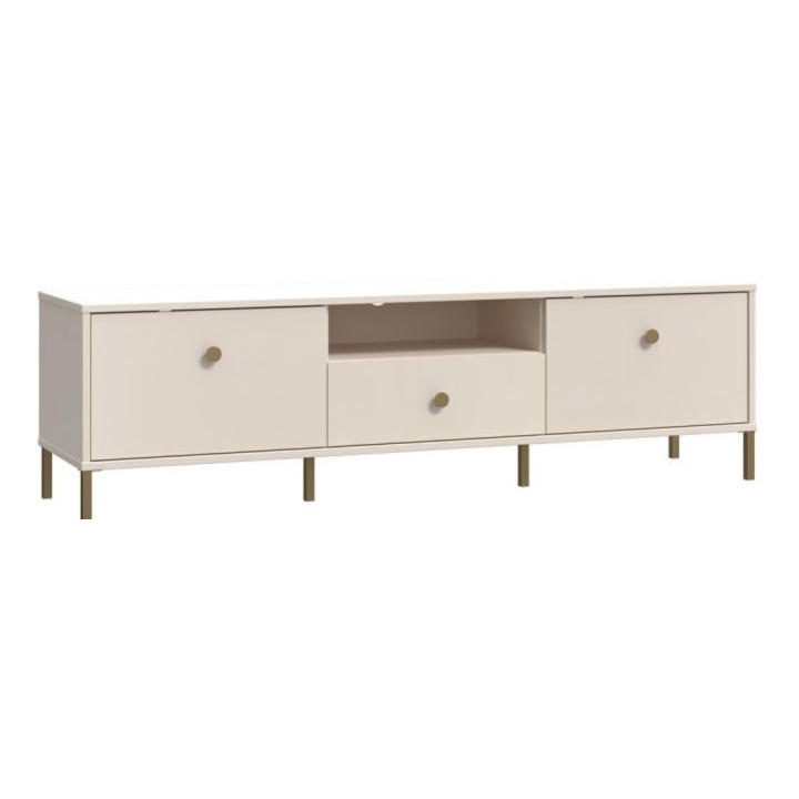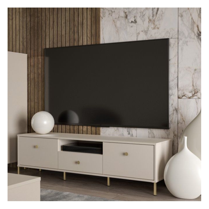 Are you looking for an elegant and functional RTV cabinet for your living room? The Salvatrice RTV cabinet from the SALVATRICE collection will be the perfect foundation for the entertainment zone in your home! Two lockable cabinets, a drawer and an open recess will provide convenient storage for your RTV equipment. The tabletop will accommodate a TV up to 75 inches and the openings in the back wall will make it easy to organise cables. Made in a trendy sand colour, with small handles and high legs in matt gold, this cabinet adds elegance to your interior. The sturdy construction and the drawer on full-extension slides ensure not only the comfort of use, but also the durability of the furniture. In addition, the soft-closing system ensures smooth and noiseless closing of the door. Protected ABS edges guarantee resistance to damage. The Salvatrice RTV cabinet will not only meet your expectations for storing equipment, but will also become a stylish element of your living room.
