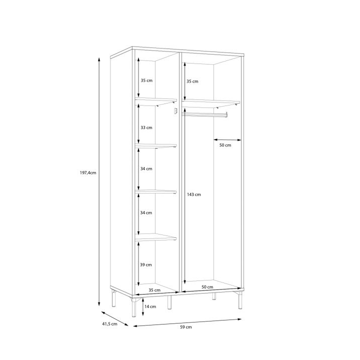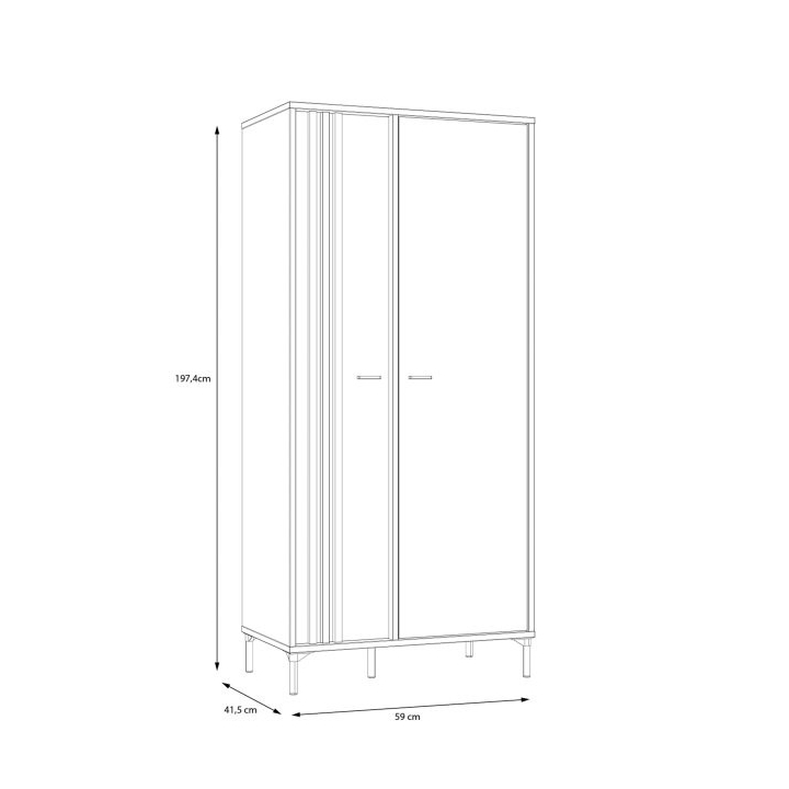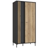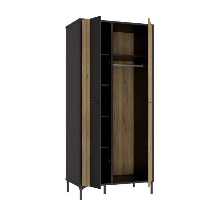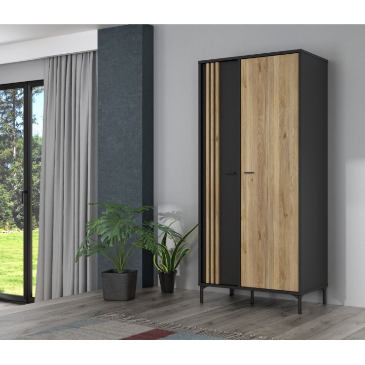 The wardrobe wardrobe from the JOAKIMIS collection is a compact wall unit measuring 92 cm wide, 198.2 cm high and 52.2 cm deep, ideal for rooms with limited space. Its interior has been intelligently designed with a clothes bar and shelves to help organise your wardrobe efficiently. Combination of decors: Mauvella Oak and Black gives the furniture character, emphasising its industrial style. The lamella insert on the door adds a fashionable accent, and the silent closing system ensures that the door closes quietly, which is particularly practical for everyday use. This 2-door hinged wardrobe will not only make your interior stand out, but also provide convenience and functionality for storing clothes and other personal belongings, especially in rooms decorated in an industrial style.