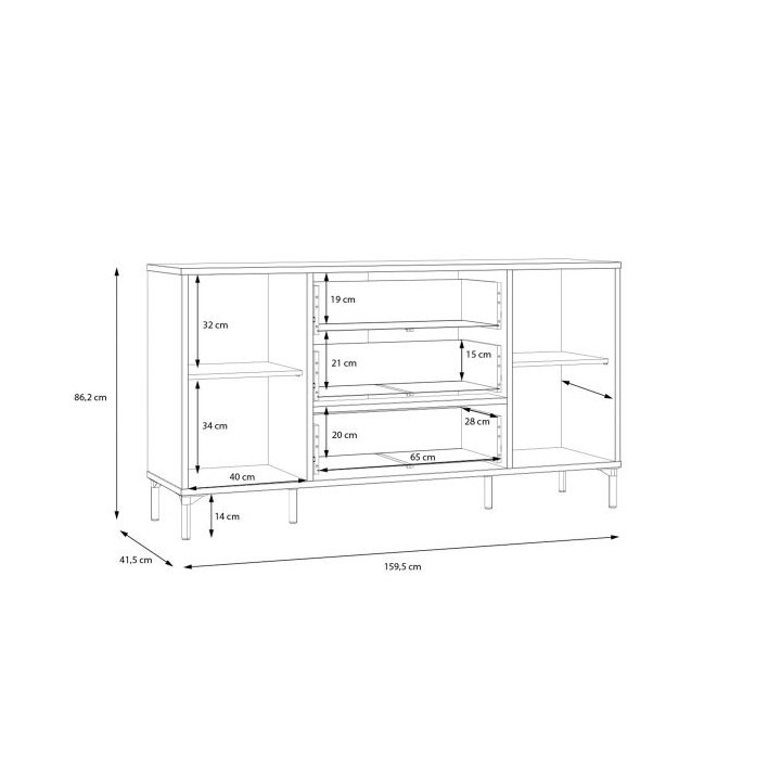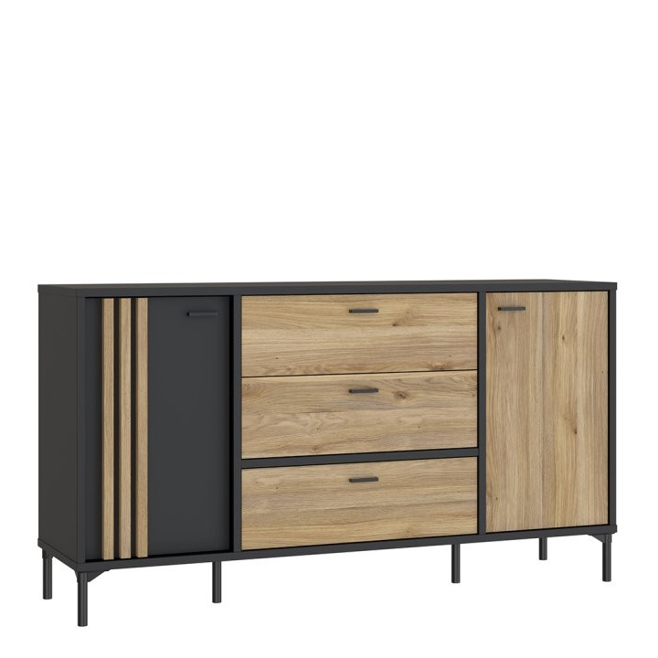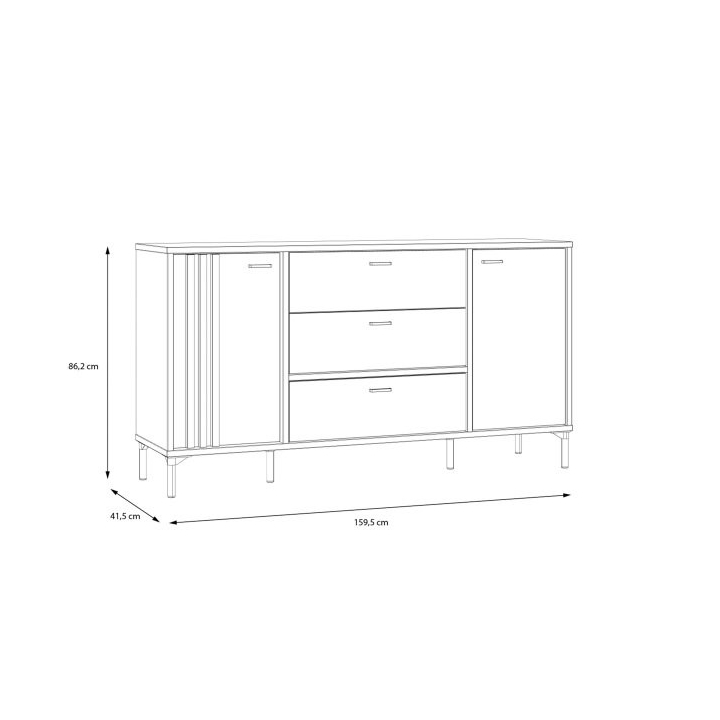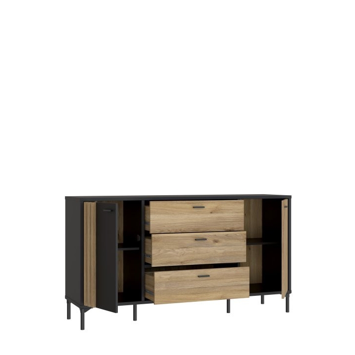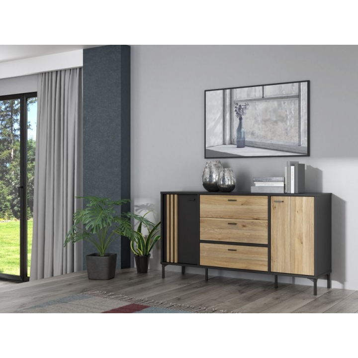 The JOAKIMIS collection chest of drawers is not only a practical piece of furniture for storage, but also a stylish design element with dimensions of 159.5 cm wide, 86.2 cm high and 41.5 cm deep. Its striking design in a combination of decors: Mauvella Oak and Black adds elegance and character to the interior. A stylish slatted insert on the door of the chest of drawers is a fashionable accent, emphasising the modern design of the furniture. ABS edging protects selected elements from damage, while the silent closing system and full drawer pull-out guarantee the comfort of use. The chest of drawers is solidly constructed and the metal handles in black add a sophisticated finish. The maximum load capacity of the drawers is 3 kg and that of the top 20 kg, which ensures the functionality and durability of the furniture. In addition, the ability to be mounted to the wall ensures stability and safety of use. This chest of drawers will perfectly accentuate the unique character of the interior while providing adequate storage space for a variety of items, making it ideal for a loft-style living room.