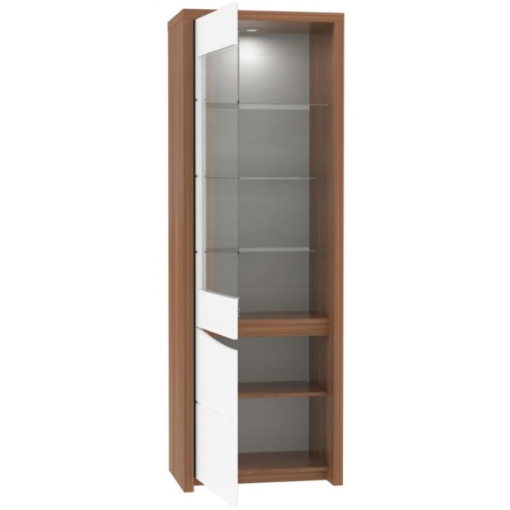 Left sideboard model STZV711LB from the Saint Tropez collection from the Polish furniture manufacturer Forte is an exclusive and functional piece of furniture for the living room. A tall display cabinet in the form of a pillar will perfectly complement the prestigious Saint Tropez collection of living room and dining room furniture, thoughtfully designed to bring luxury and comfort to interiors. The combination of warm oak décor with glossy white fronts brings lightness and lightness to the interior. The three glass shelves hidden behind the glass front will impressively display eye-catching objects, while the additional lower cabinet behind the full front will allow you to organise documents or table decorations. LED lighting mounted in the display case will further accentuate the display.
