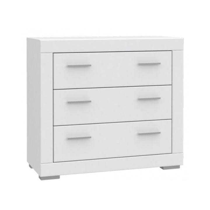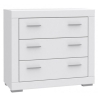 The chest of drawers from the Snow collection by the manufacturer Forte is a functional and aesthetically pleasing, visually light cabinet for a hallway, living room or bedroom. The snowy white colour makes the piece of furniture optically enlarge and brighten the interior. The chest has three capacious drawers with a quiet closing system. They will accommodate small clothing accessories, such as scarves, accessories, underwear or electronics (tablets, cables, batteries, speakers, CDs) or cosmetics. A chest of drawers will work perfectly in a bedroom, dressing room or as a dressing table. Simply hang a mirror above it and you have an elegant place to groom yourself and apply make-up. The simple, geometric form and uniform white colour makes this dresser from the Snow collection from Forte timeless and will fit into many arrangements.