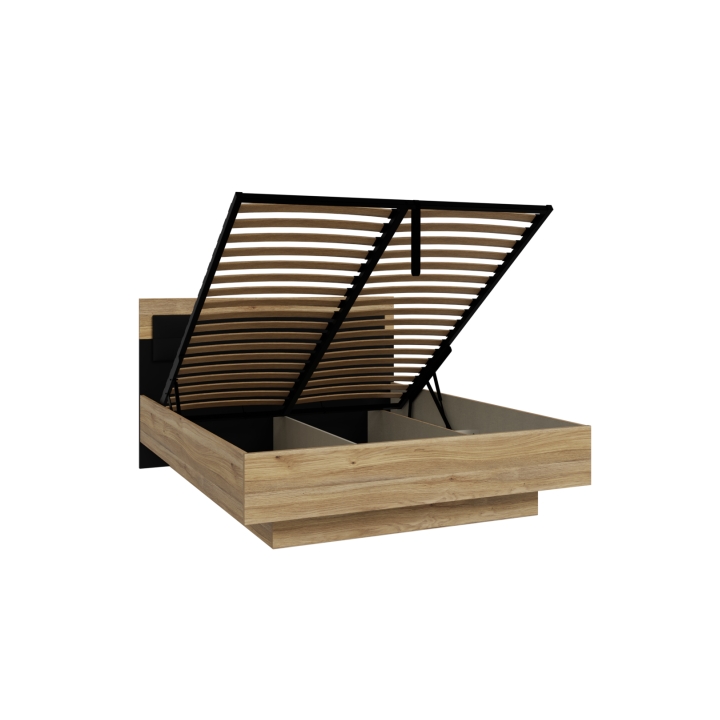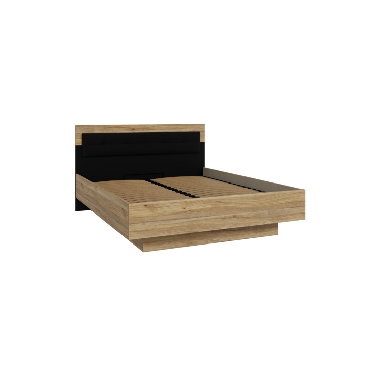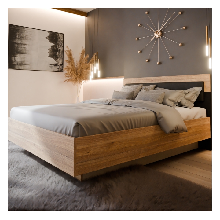 The bed measures 145 cm in width, 205 cm in length and 99.5 cm in height, making it suitable for most bedrooms, regardless of their size. With a colour scheme in a combination of brown and black, including the Mauvella Oak decor, the bed brings warmth and modern style to the interior, blending perfectly with a variety of interior designs.