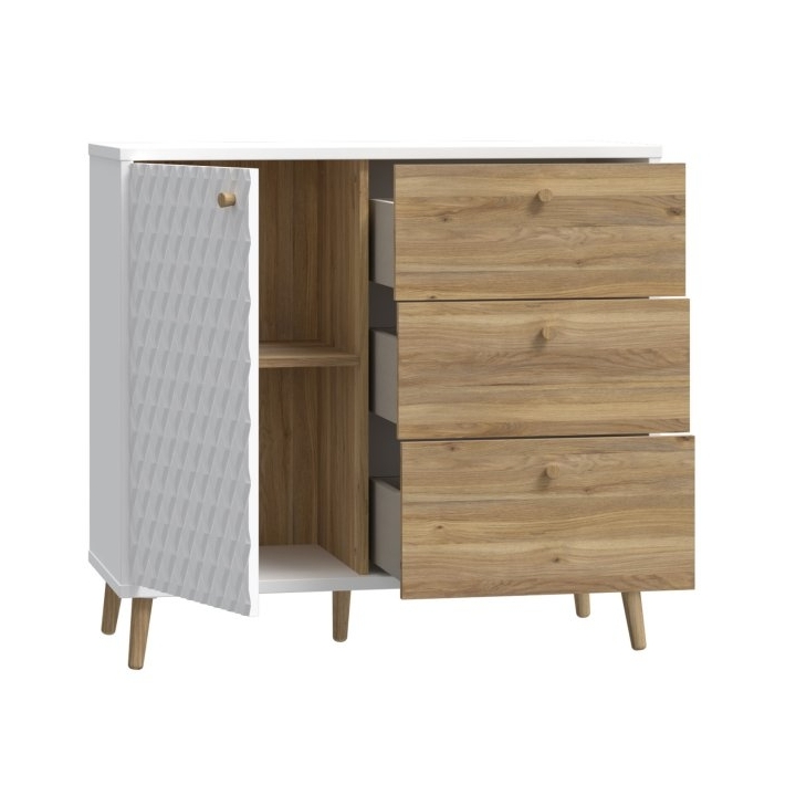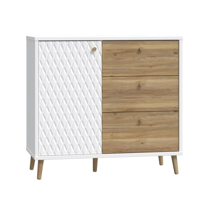 The chest of drawers has 1 hinged door with a silent closing system, behind which there is 1 shelf, and 3 capacious drawers on full-extension slides, which ensures convenient access to the stored items. The brown handles and matte finish of the body emphasise the modern style of the furniture.