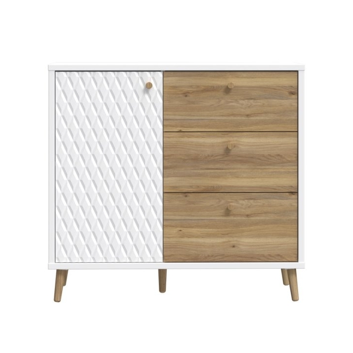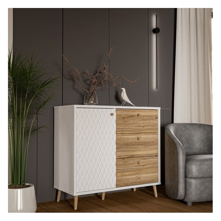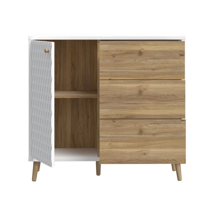 The fronts of the chest of drawers are made of MDF and finished in white and Mauvella oak, creating a harmonious combination of modern and natural tones. The fluted front on the cabinet side adds a structured character to the furniture, making it stand out from other pieces of furniture. The body made of particle board in white and the high MDF legs in Mauvella oak add lightness to the chest of drawers, which also makes it easier to keep the furniture tidy underneath.
