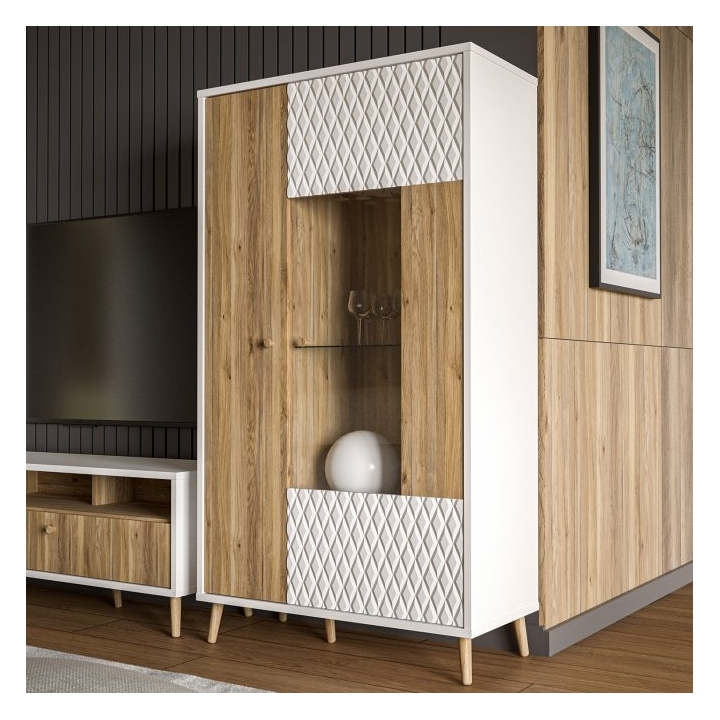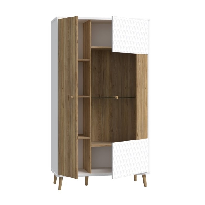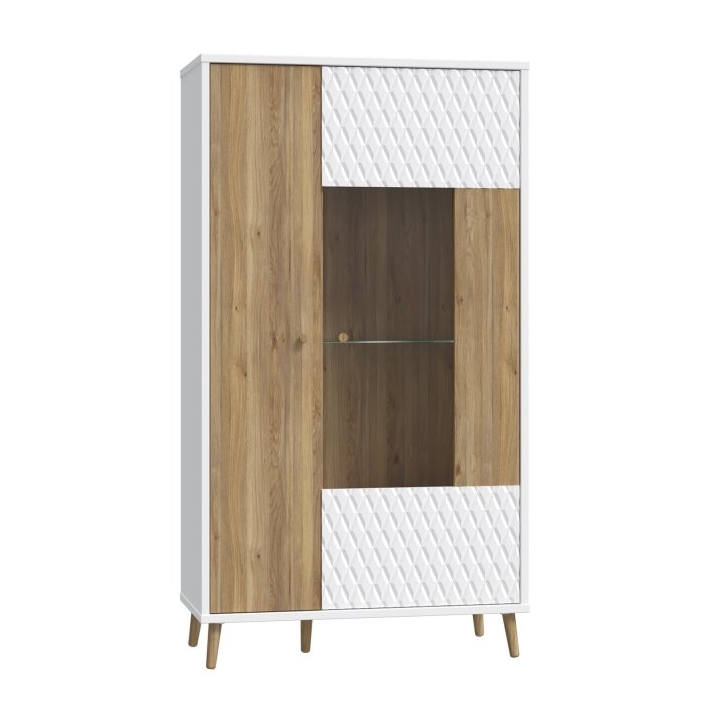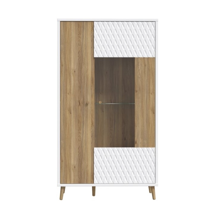 The fronts of the display cabinet are made of MDF in a combination of white and Mauvella oak colours, which gives the furniture an original and modern character. The fluted fronts give it a unique look, while the glazed part allows for an attractive presentation of objects. The showcase's white chipboard body and high legs in Mauvella oak emphasise the Scandinavian aesthetic and add lightness to the whole.