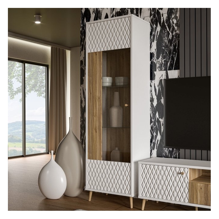 The fronts of the display cabinet are made of MDF in a combination of white and Mauvella oak, which creates a harmonious colour combination, while the fluted finish adds a structured touch. The white chipboard body and the high legs in oak Mauvella emphasise the lightness and modern look of the furniture. The glazed doors with silent closing allow you to stylishly display your decorations, memorabilia or tableware, while the optional LED lighting will add a unique glow to your items.