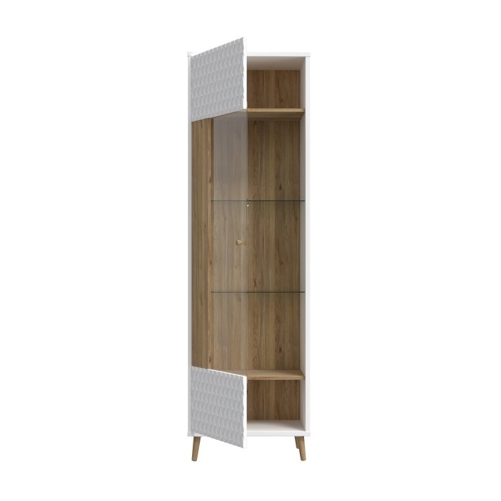 The display cabinet is 1-door and comes with 4 shelves, two of which are glass shelves, allowing you to store items of different sizes in an organised manner.