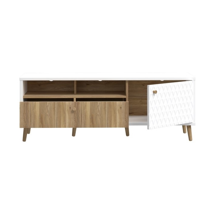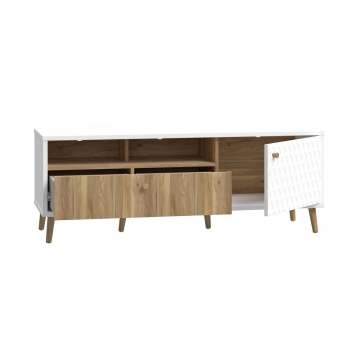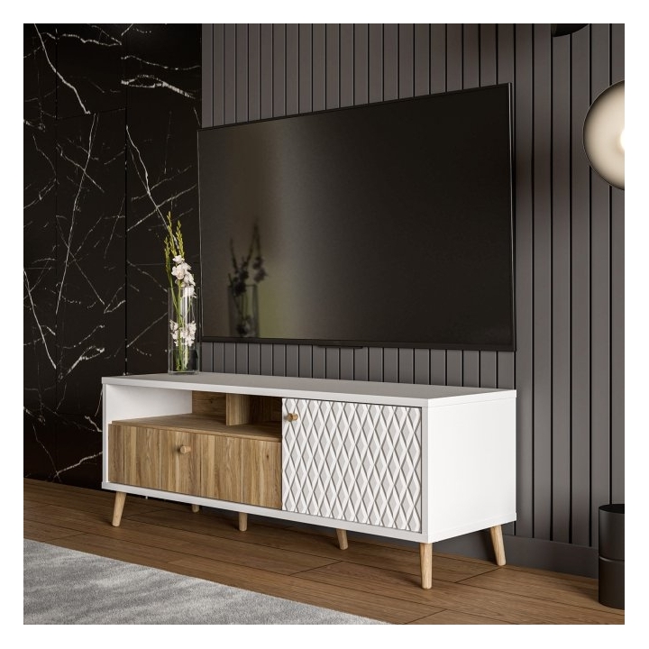 The RTV cabinet is equipped with a 1-door front with a silent closing system and 1 drawer, as well as an open space for electronic equipment, which allows for a comfortable arrangement of all devices.
