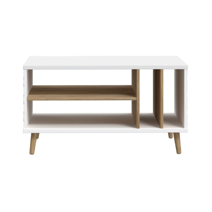 The table is made of particle board in white with Mauvella oak accents that appear on both the body and the high wooden legs. The combination of these colours brings harmony and warmth to the interior, while the minimalist design of the table is eye-catching and blends well with the rest of the Aksana collection.