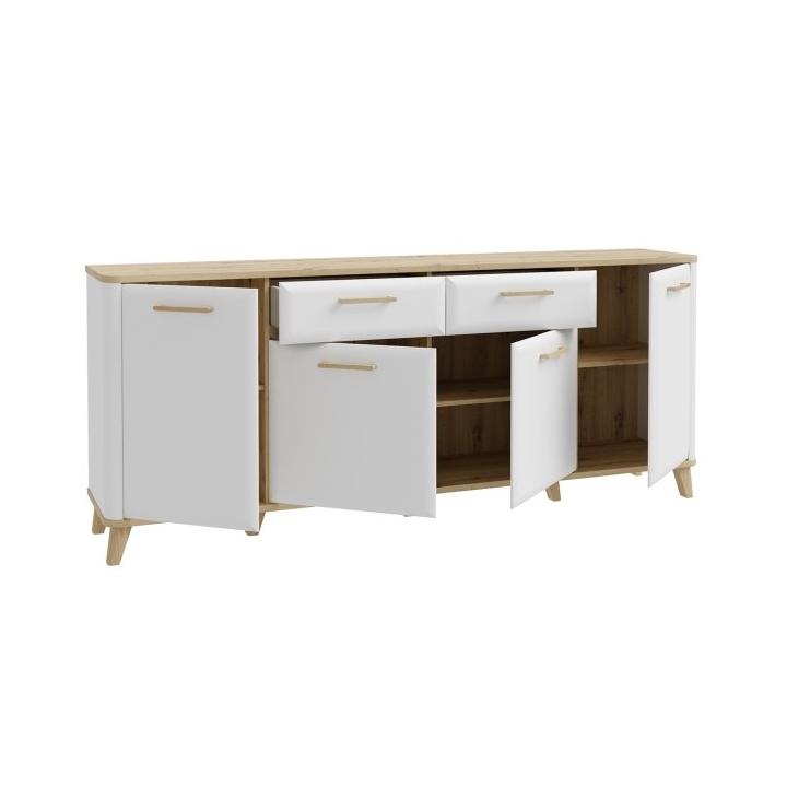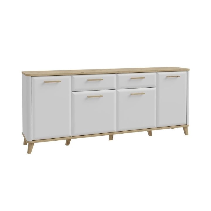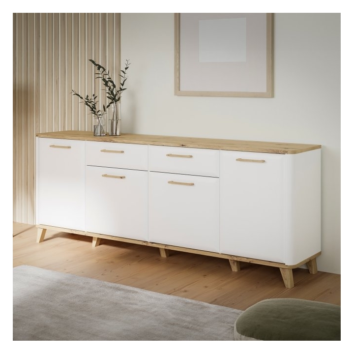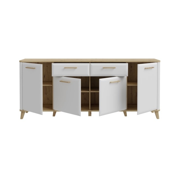 The piece of furniture is made of particle board in white, and its high wood legs in artisan oak add lightness and make it easy to keep the underneath of the chest of drawers tidy. The chest of drawers has 4 hinged doors and 2 drawers, which are equipped with a silent closing system for comfortable and noiseless use. The matt MDF fronts and subtle wooden handles emphasise the modern, minimalist design.