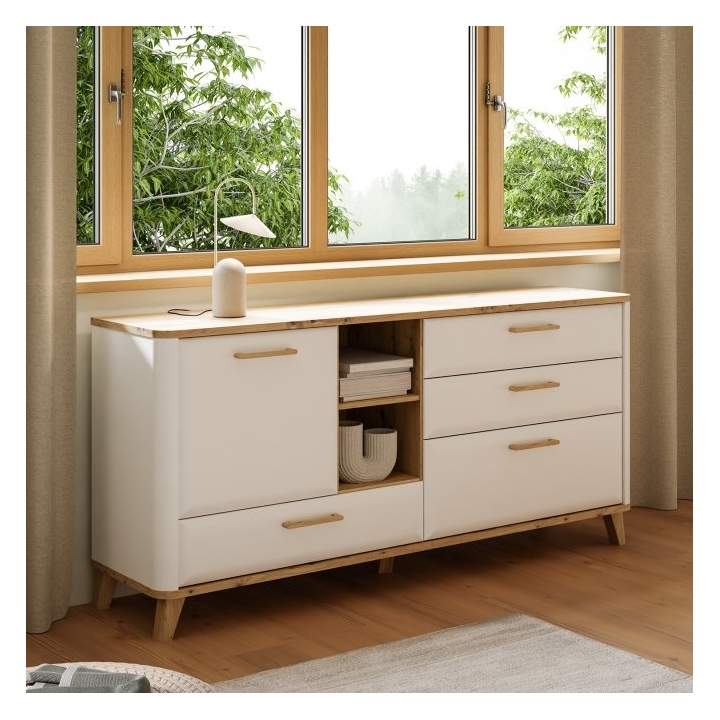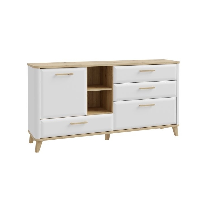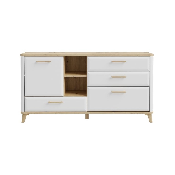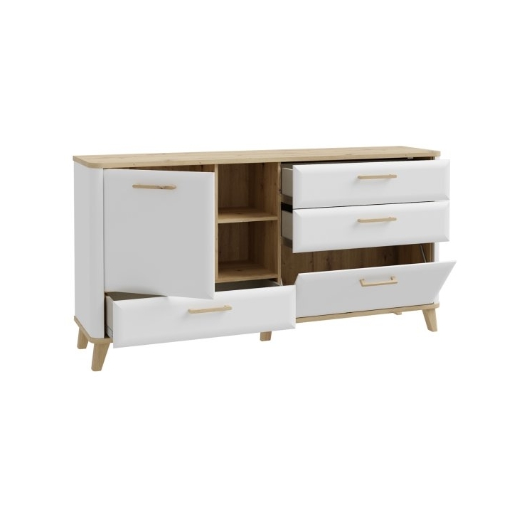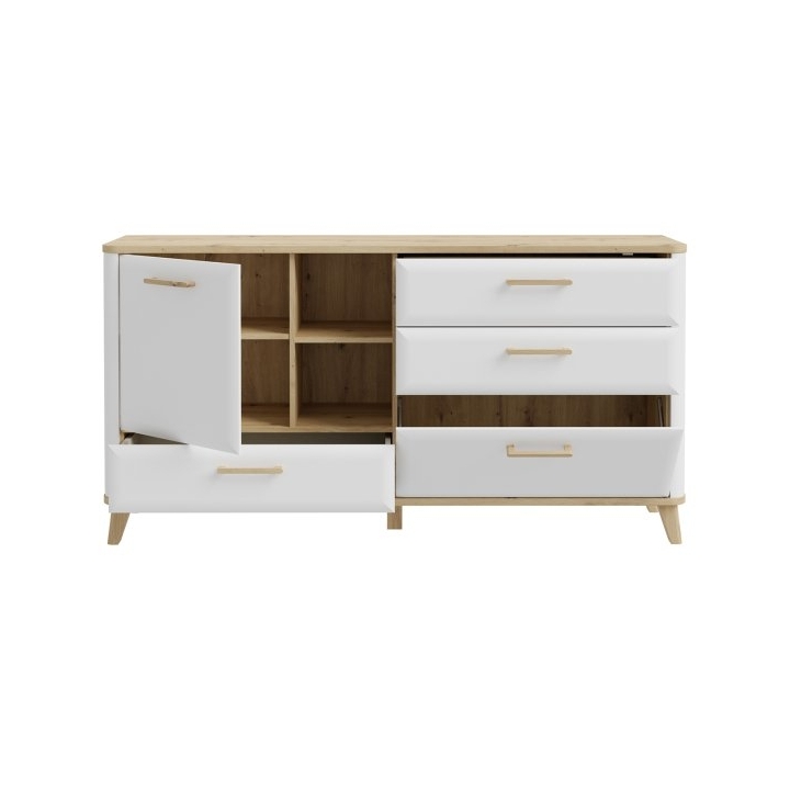 The piece of furniture is made of chipboard in white and its matt MDF fronts emphasise the modern, subtle look. The unique combination of White / Artisan Oak decors gives the chest of drawers a warm and natural character that will bring cosiness and harmony to the interior.