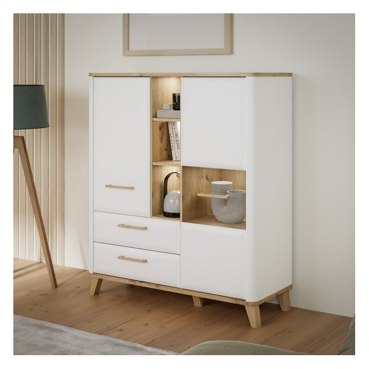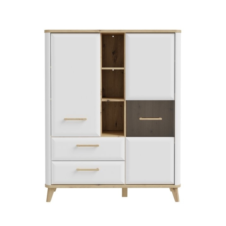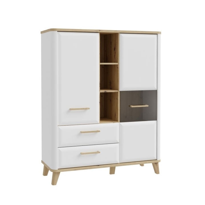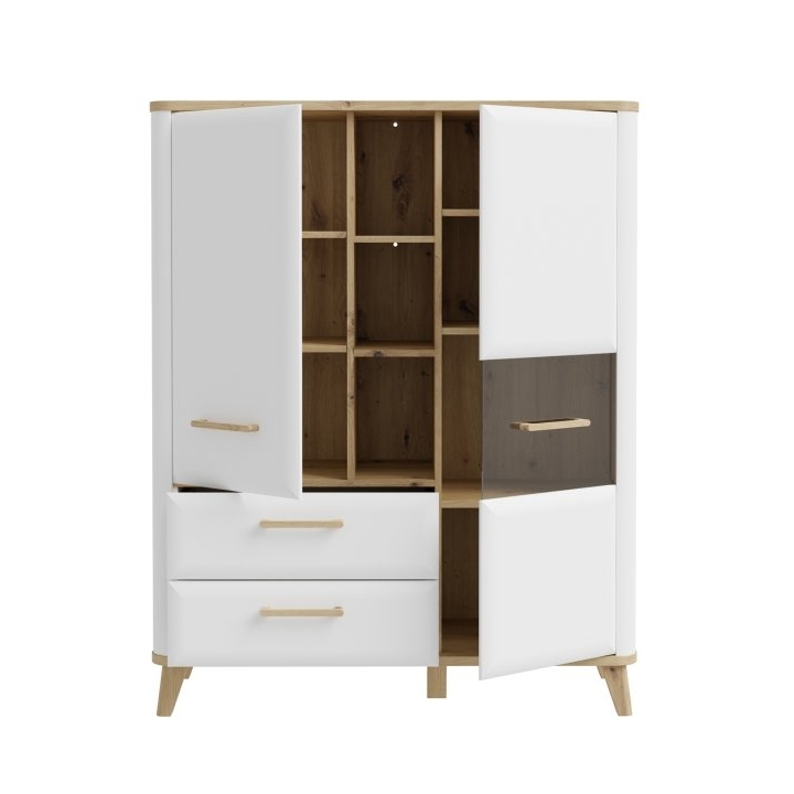 The cabinet has 2 hinged doors and 2 capacious drawers with a silent closing system, which guarantees comfortable use without noise. Inside there are 5 shelves which offer plenty of storage space. The glazed part of the display cabinet allows you to effectively display your favourite decorations, books or souvenirs, and the additional option of installing LED lighting will give the whole unit a unique character and emphasise the atmosphere of the room.