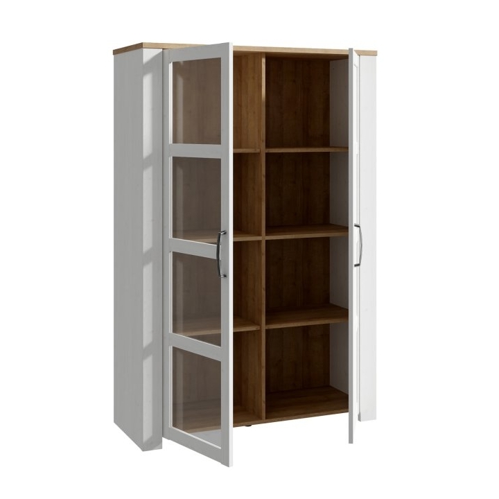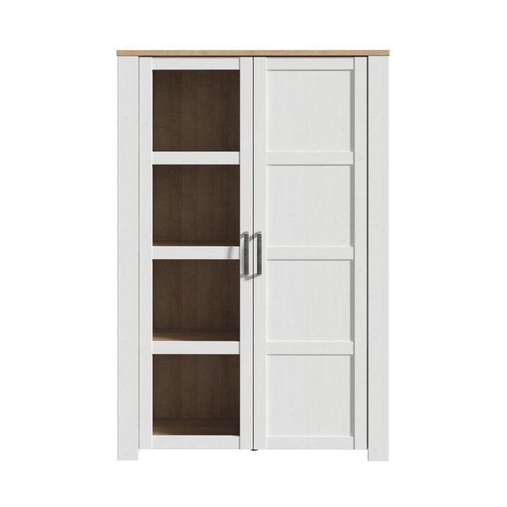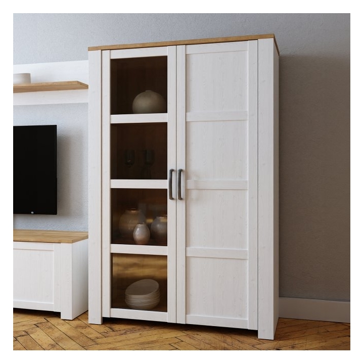 Two-door showcase BHLV621-M482 Chisbury from Forte with the dimensions 106cm wide, 161cm high 42cm deep is a stylish piece of furniture that will perfectly fit into Provencal interiors. Thanks to the combined colours it brings freshness and cosiness into the room. The fronts are made of MDF in the colour of Bright Sibiu Larch on the body - Bright Sibiu Larch, the top rim - Riviera Oak, creating a harmonious composition.