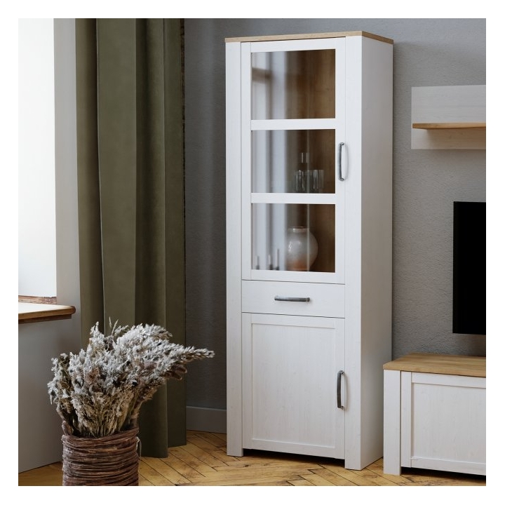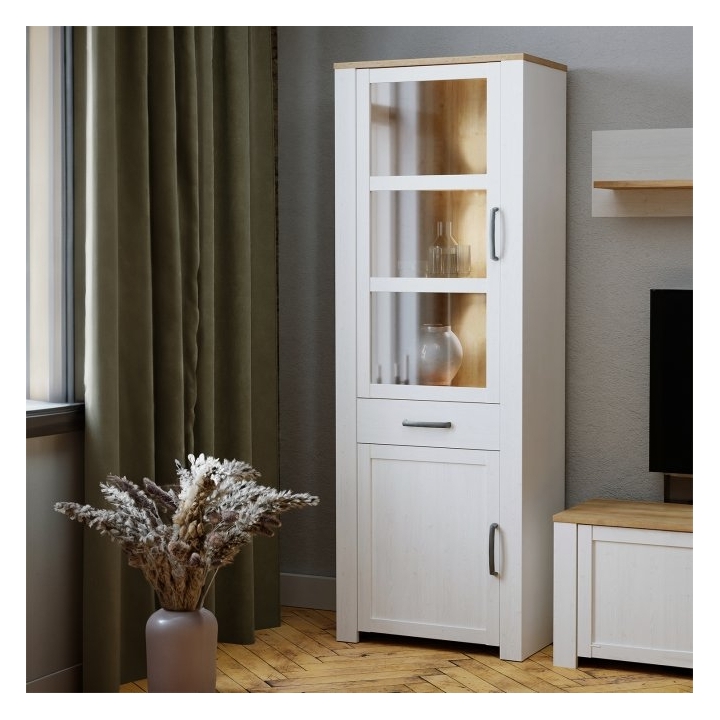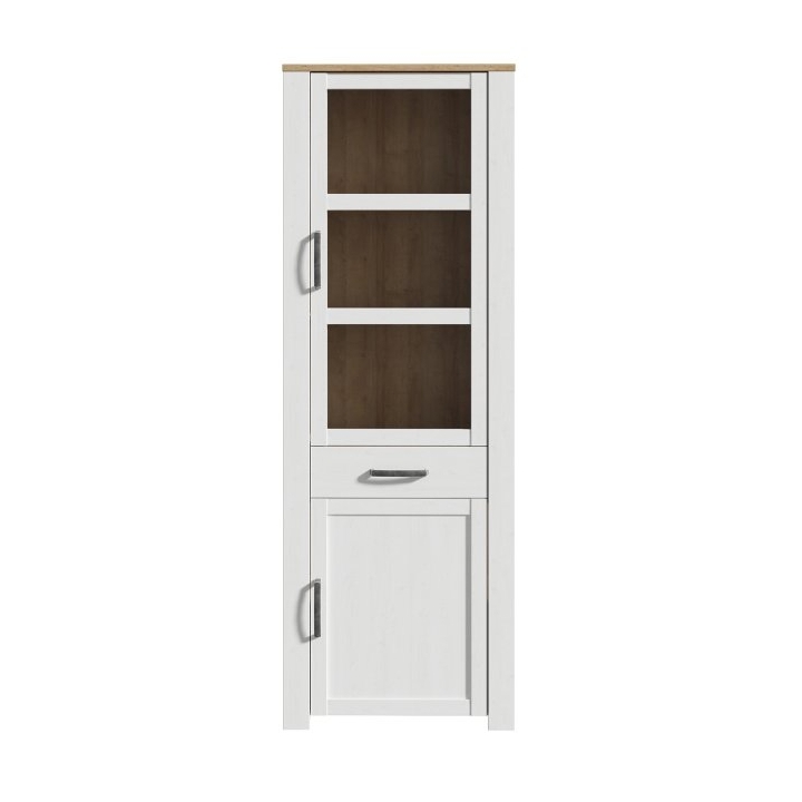 The Chisbury BHLV712-M482 display cabinet from Forte with the following dimensions: 72cm wide, 205cm high 42cm deep, is a modern piece of furniture that will be perfect for any living room or dining room interior. Made from chipboard and MDF, it combines the shades of Sibiu Bright larch and Riviera oak, giving it a natural look. Matte fronts and silver handles combined with grey plastic legs emphasise the contemporary style of the display cabinet.