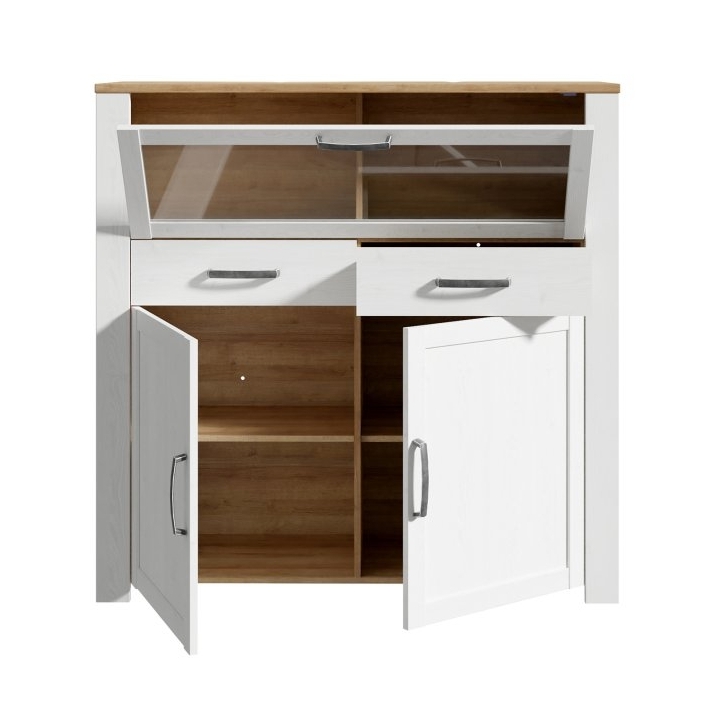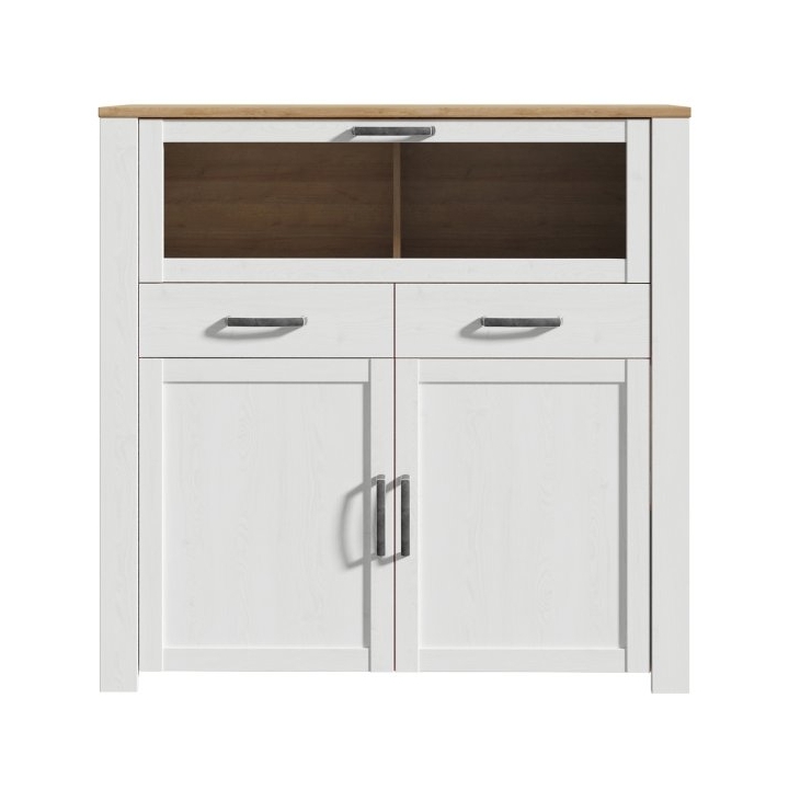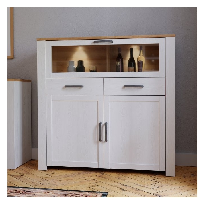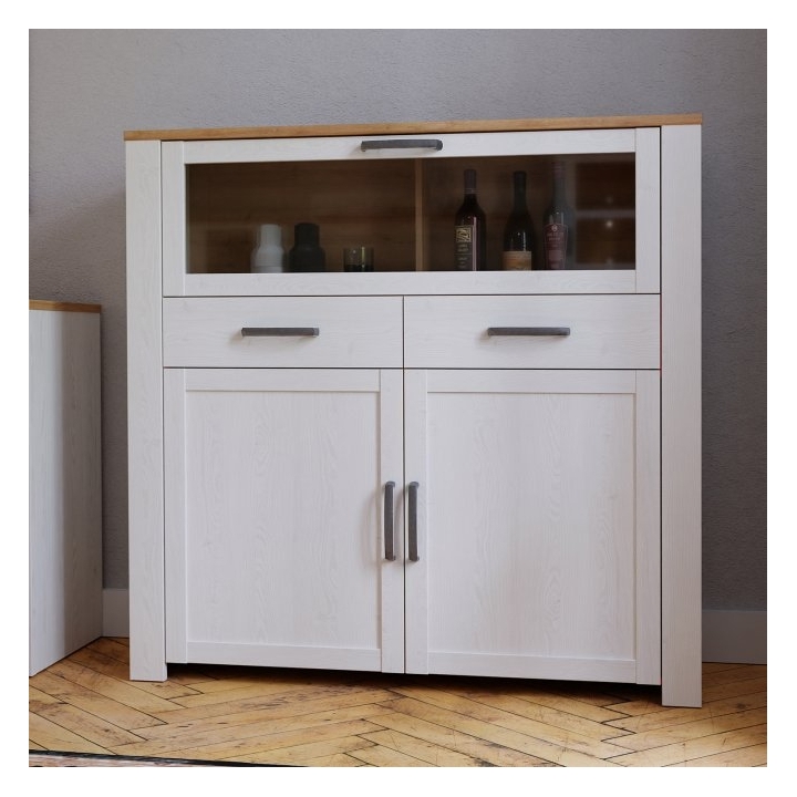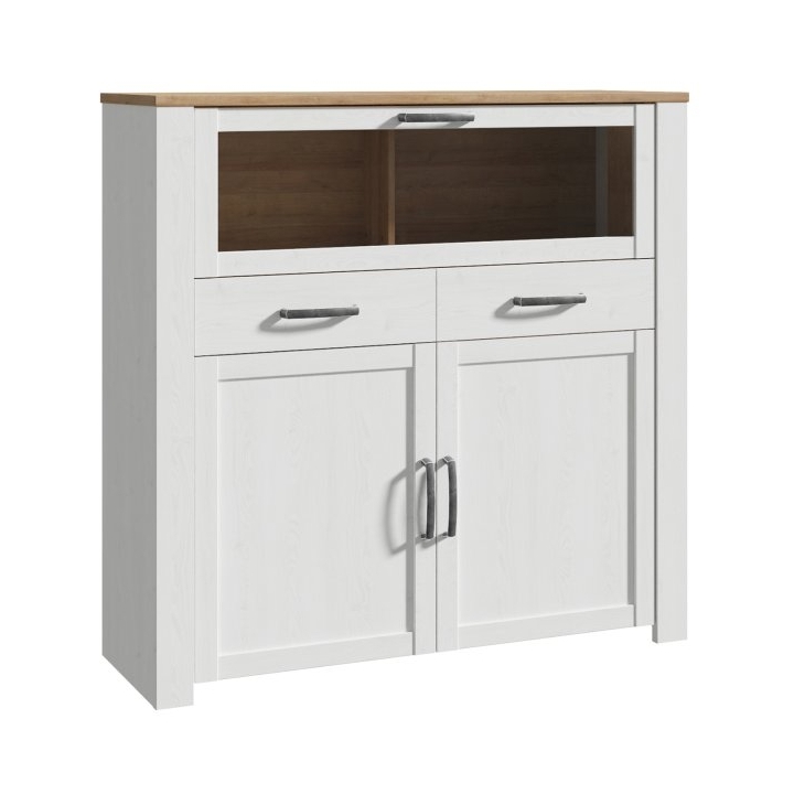 TheBHLK321-M482 Chisburylow display cabinet is a piece of furniture with a modern design that combines Siberian Light Larch with a natural Riviera oak accent Made of chipboard and MDF fronts , the cabinet has three doors, one of which is glazed, and two drawers ideal for storing small items. Comfort of use is ensured by a silent closing system.