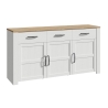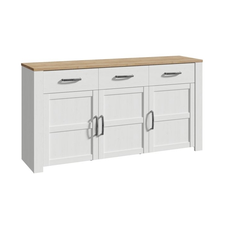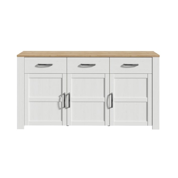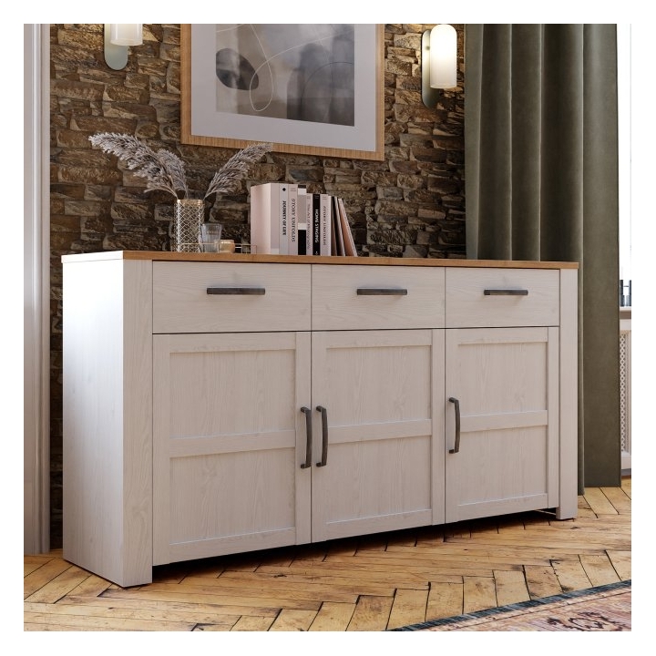 The Chisbury BHLK231-M482 chest of drawersfrom Forte with the following dimensions: width 166cm, height 87cm, depth 42cm is a modern piece of furniture which will fit perfectly into a Provencal style living room or bedroom. Finished in the shade ofSibiu Larch Bright, with wood accents on the top in the colour of Riviera Oak, it brings a warm, natural character to the interior. Matte MDF fronts and a particleboard body emphasise its contemporary style.