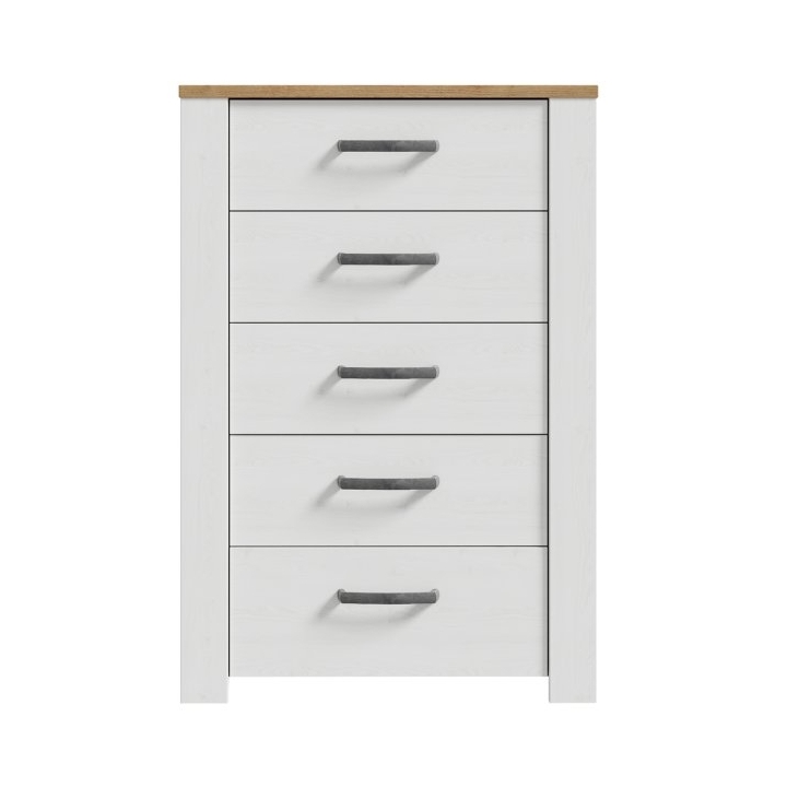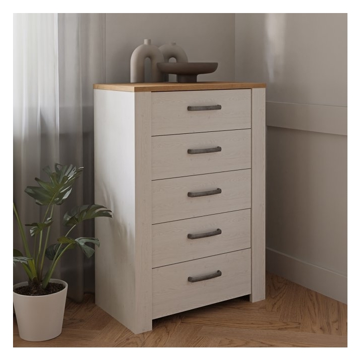The wood-coloured top is a contrasting accent, warming up the overall colour scheme of the furniture. Thanks to its simple design and compact dimensions, the chest of drawers is ideal for smaller rooms, offering excellent storage space in style. Ideal for the living room, bedroom or hallway.
