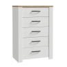 The chest of drawers has five capacious drawers to store a variety of items. The matt fronts with silver handles add a distinctive touch, while the grey plastic legs emphasise the modern style.