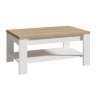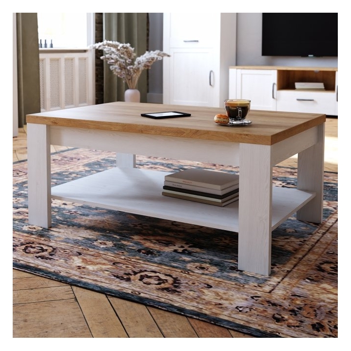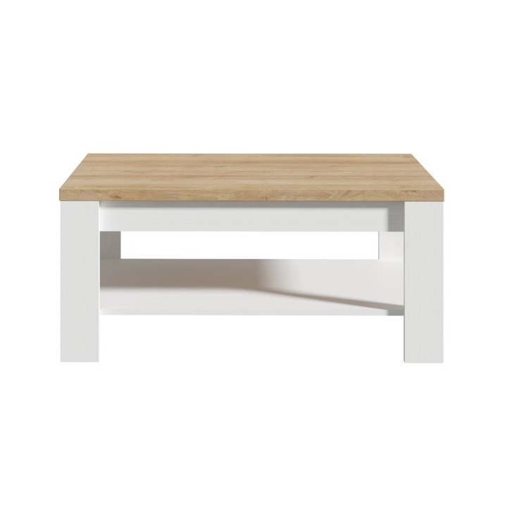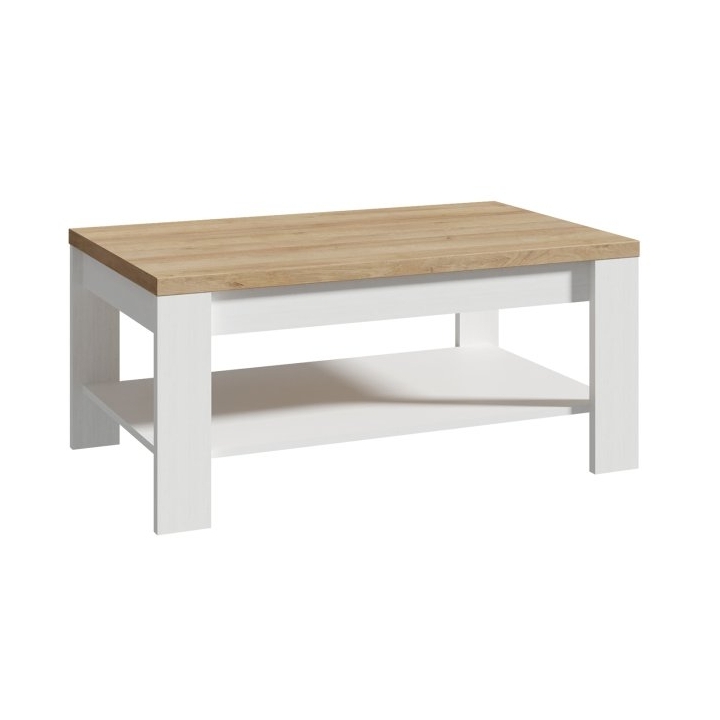 The chipboard top in Riviera oak adds a warm touch to the interior, while the light Sibiu larch on the legs and body emphasises its modern character. The table is equipped with one shelf under the top where you can store books, remote controls or other small items, so that the space remains tidy.