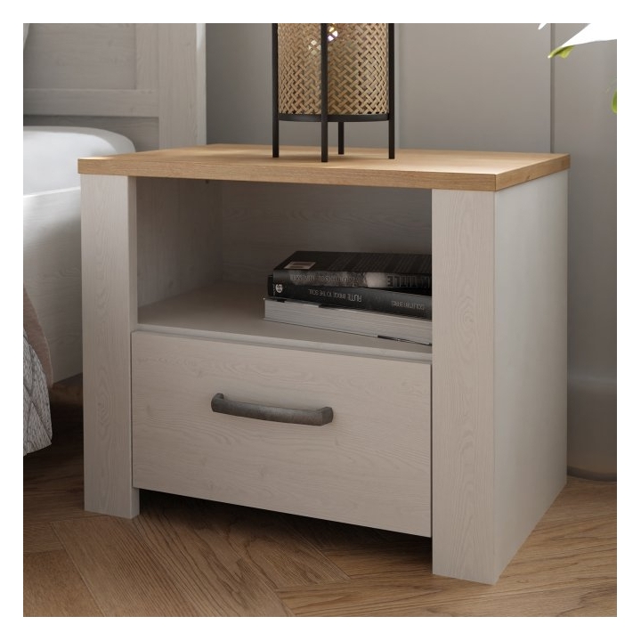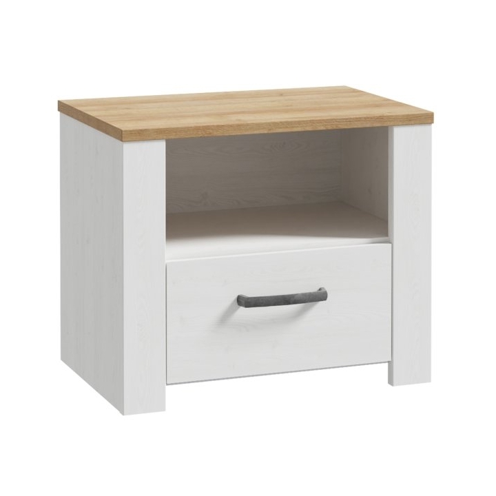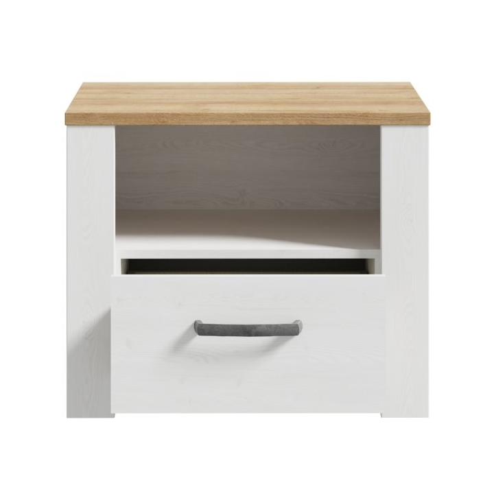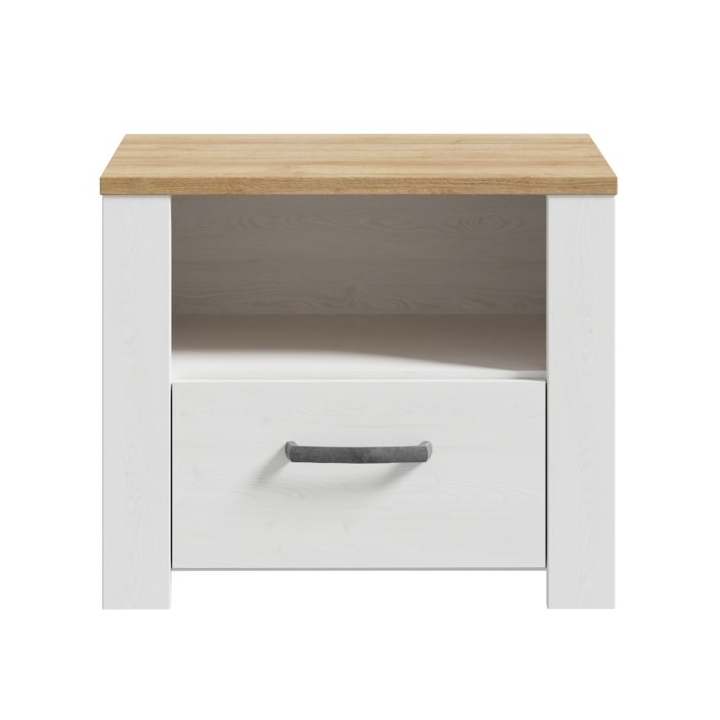 The Chisbury BHLK011-M482 bedsidecabinet is a modern piece of furniture that is perfect for a bedroom with a light colour scheme. It measures 61.6 cm wide, 42 cm deep and 52 cm high, making it perfect for the bedside, offering space for essential items. The top in Riviera oak décor makes it possible to place a lamp, a book or other small items worth having at hand. The handle is made of plastic in the colour of old silver.