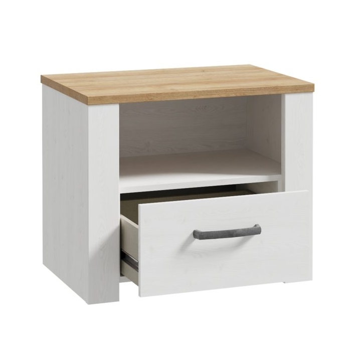 The furniture is equipped with one drawer, which allows you to store small items, and the solid matt chipboard body in Sibiu Bright larch adds subtlety. The cabinet retains its durability thanks to ABS protected edges, which protects it from damage during everyday use.
