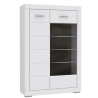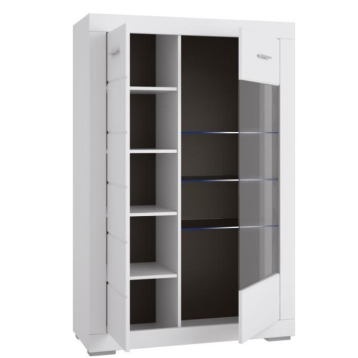 The functional and modern display cabinet from the Snow collection by Forte offers plenty of storage space. The left side, hidden behind a full, narrow front hides five recesses separated by shelves, and the right, wider and partially glazed front opens onto glass shelves on which you can display beautiful objects, books, souvenirs, service and other eye-catching items. The display cabinet provides for the possibility of installing IZ13BL LED lighting, which will further accentuate the interior and the entire room. The edges of the cabinet are finished with ABS edging, which increases the durability and quality of use of the furniture.