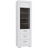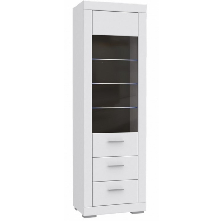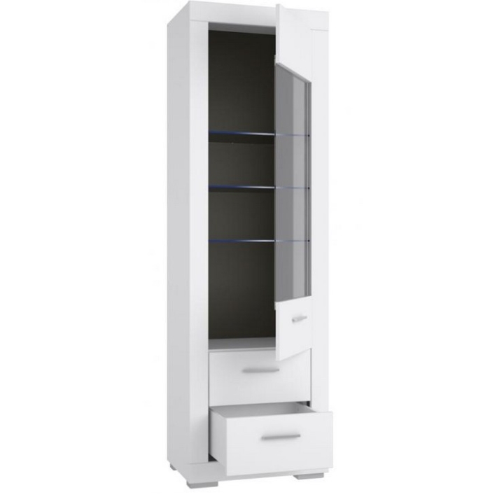 The functional and modern display cabinet from the Snow collection by Forte offers plenty of storage space. Opening to the right side, the pillar-type display cabinet behind a partially glazed front has capacious glass shelves on which you can display beautiful objects, books, souvenirs, service and other eye-catching items. The cabinet provides for the possibility of installing IZ13BL LED lighting, which will further emphasise the interior and the entire room. The edges of the cabinet have been finished with ABS edging, which increases the durability and quality of use of the furniture. Two drawers for accessories have been provided under the glazed section.