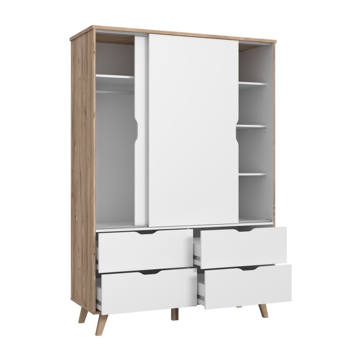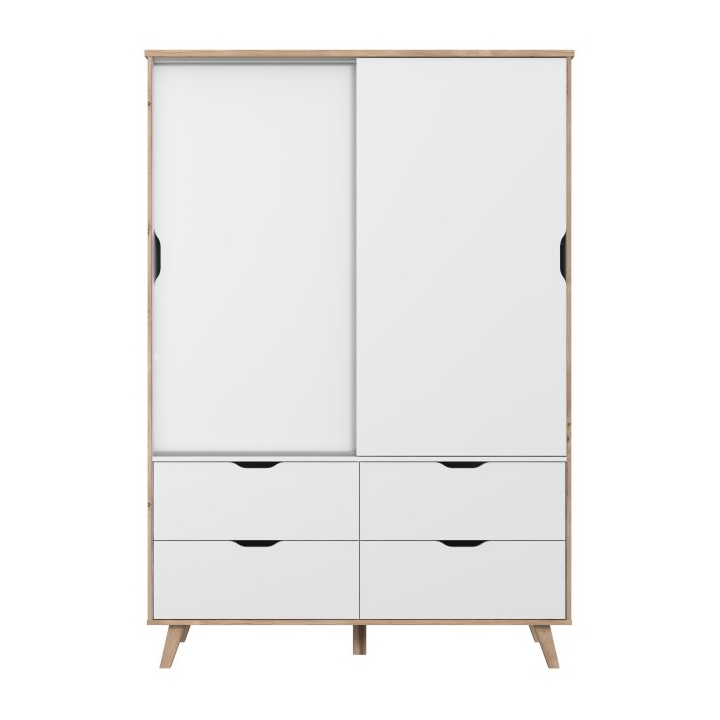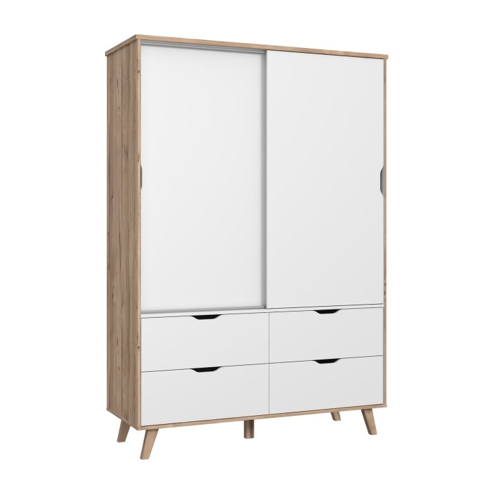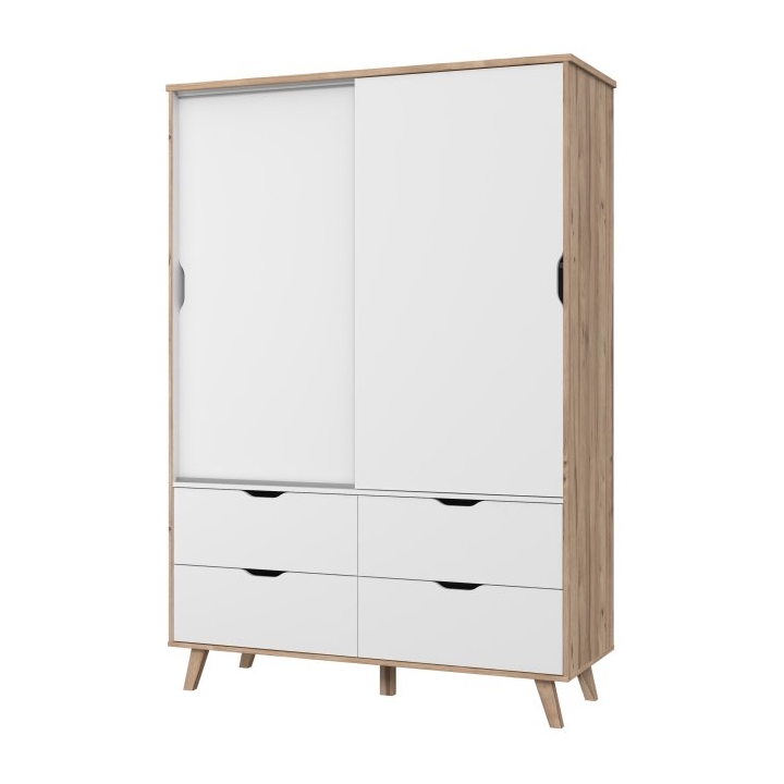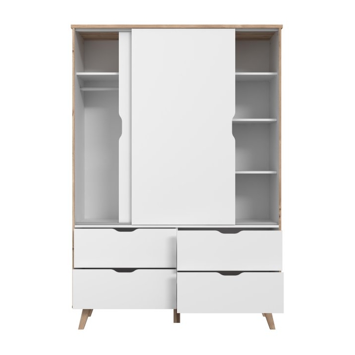 The wardrobe has been made of chipboard and HDF board, which guarantees the durability of the construction. ABS edging increases resistance to damage and the drawer slides make it easy to use on a daily basis. Metal handles in the colour of aluminium emphasise the modern character of the furniture. The colour scheme in the shade of light oak and white fronts gives the interior a natural look and fits into many arrangements.