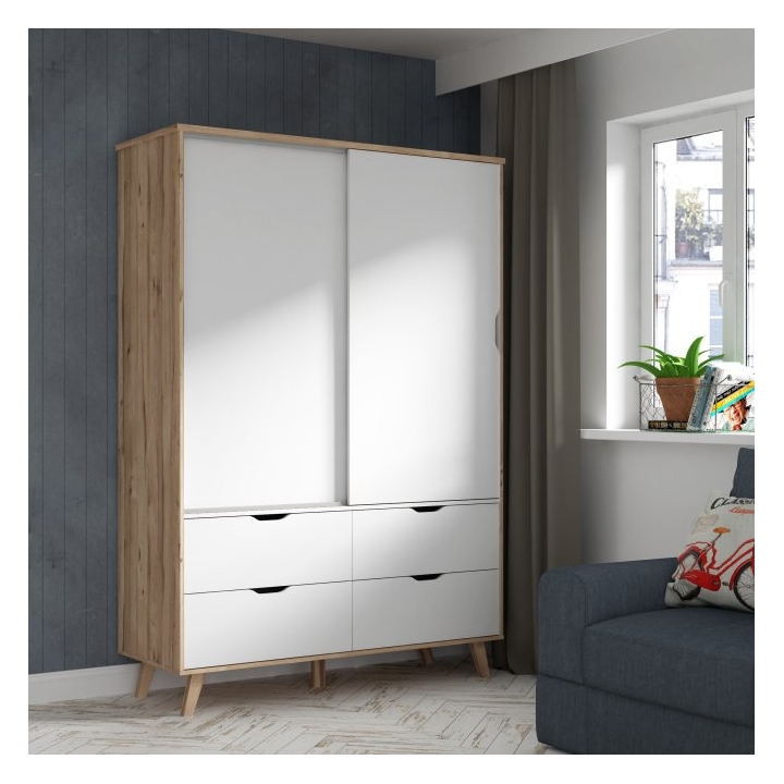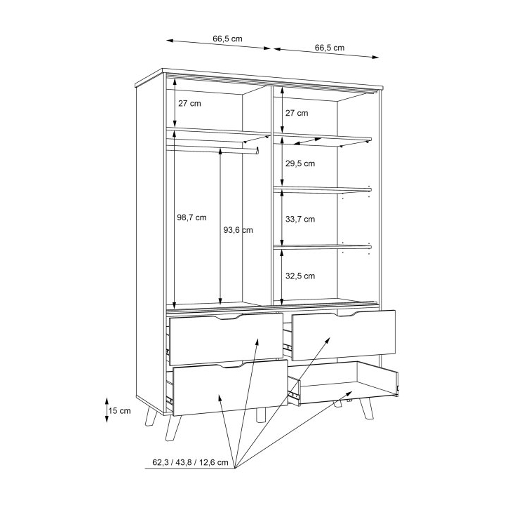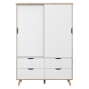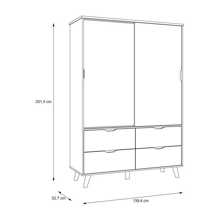 The VNKS821-C338 Vankka Forte wardrobe is a 139.4 cm wide, 201.5 cm high and 52.7 cm deep model designed for convenient storage of clothes. Sliding doors allow easy access to the interior, while well thought-out solutions such as a hanger bar, four shelves and four capacious drawers ensure ample storage capacity and orderly organisation of space.