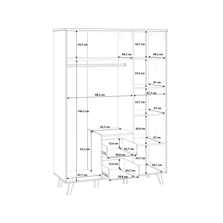 This model has three hinged doors, behind which hides a carefully designed interior. On the left side there is a wide space with a hanger bar, which allows clothes to be stored comfortably in a hanging position - its maximum load capacity is 25 kg, so it can easily accommodate jackets, coats or shirts. Above the bar there is an additional shelf for less frequently used items, such as seasonal clothes or bed linen.